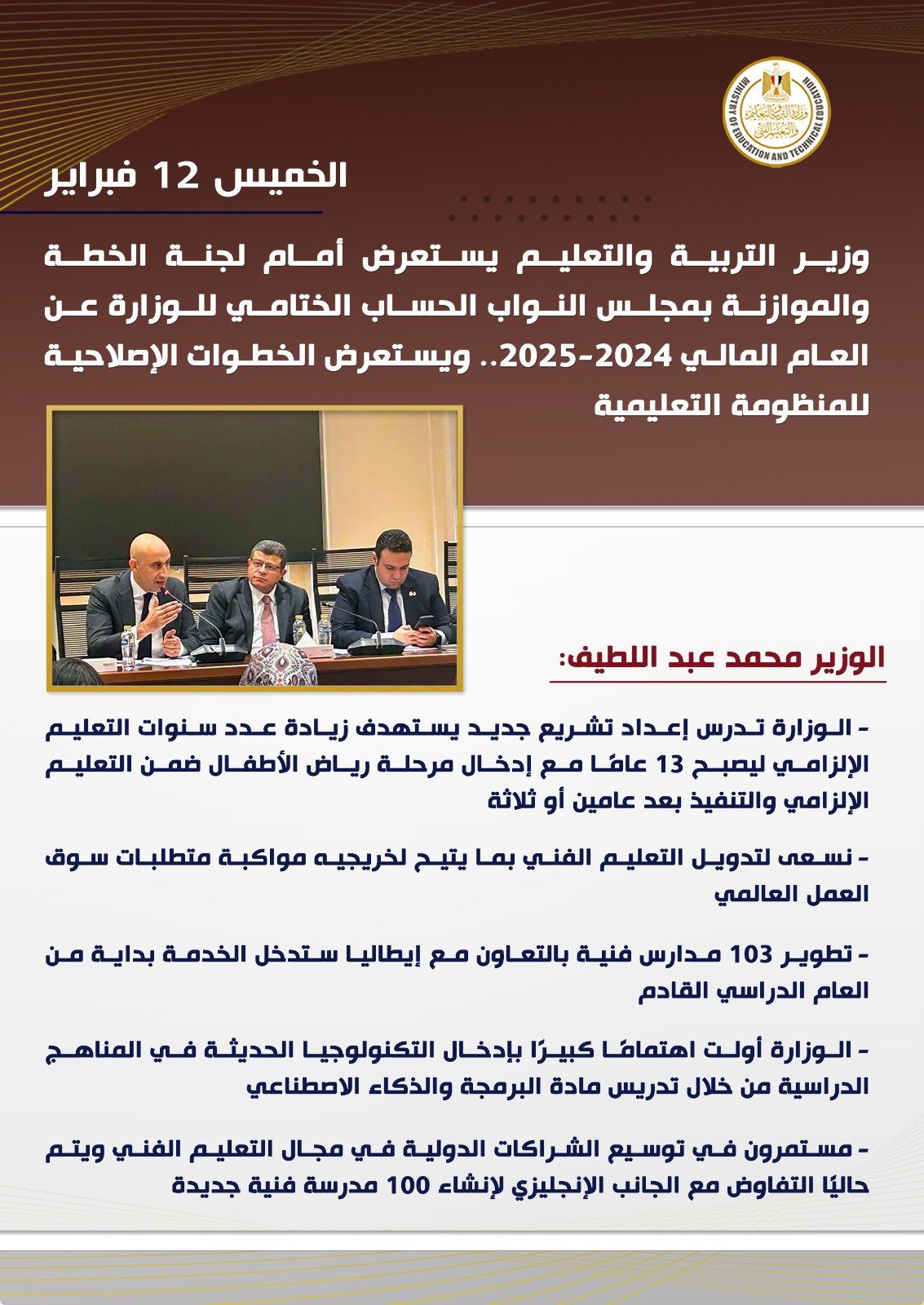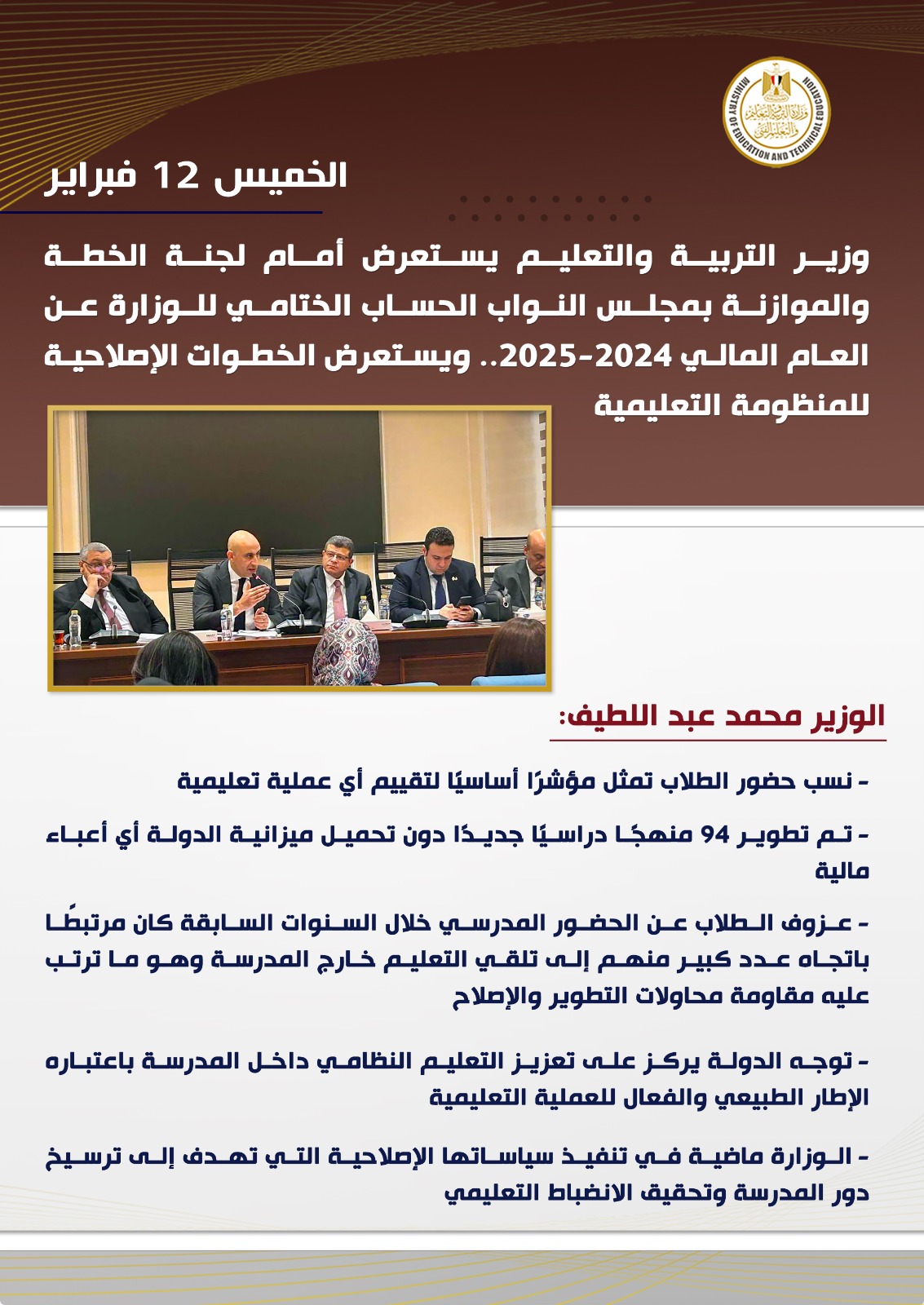 واستعرض الوزير محمد عبد اللطيف موقف تنفيذ موازنة الوزارة، وأوجه الصرف، ومدى توافقها مع الأهداف المحددة، إلى جانب موازنة البرامج والأداء لديوان عام الوزارة، بما يعكس كفاءة توجيه الاعتمادات المالية لخدمة العملية التعليمية وتحقيق المستهدفات المقررة.