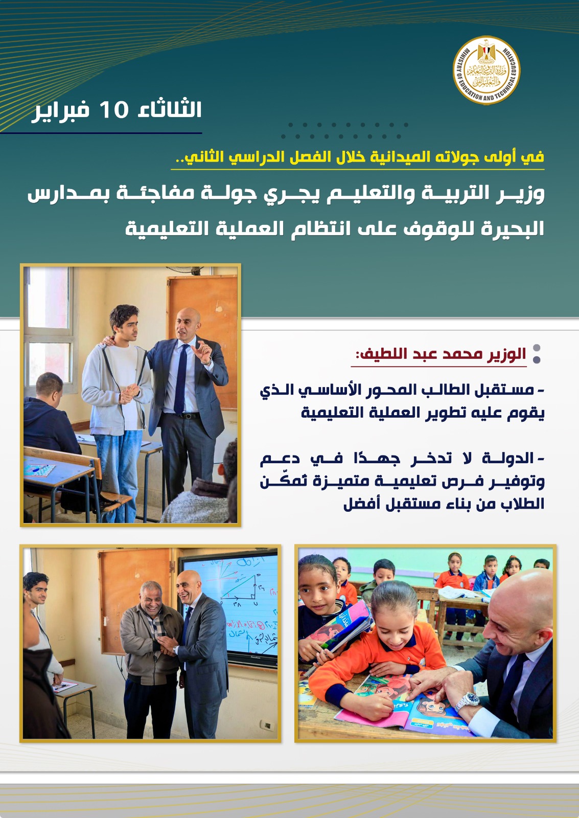 في أولى الجولات الميدانية خلال الفصل الدراسي الثاني، قام السيد/ محمد عبد اللطيف، وزير التربية والتعليم والتعليم الفني، بجولة تفقدية مفاجئة بعدد من مدارس محافظة البحيرة، لمتابعة انتظام سير العملية التعليمية والوقوف على مستوى الأداء والانضباط داخل المدارس، وذلك في إطار حرص الوزارة على تكثيف المتابعة الميدانية المستمرة لمختلف مدارس الجمهورية.