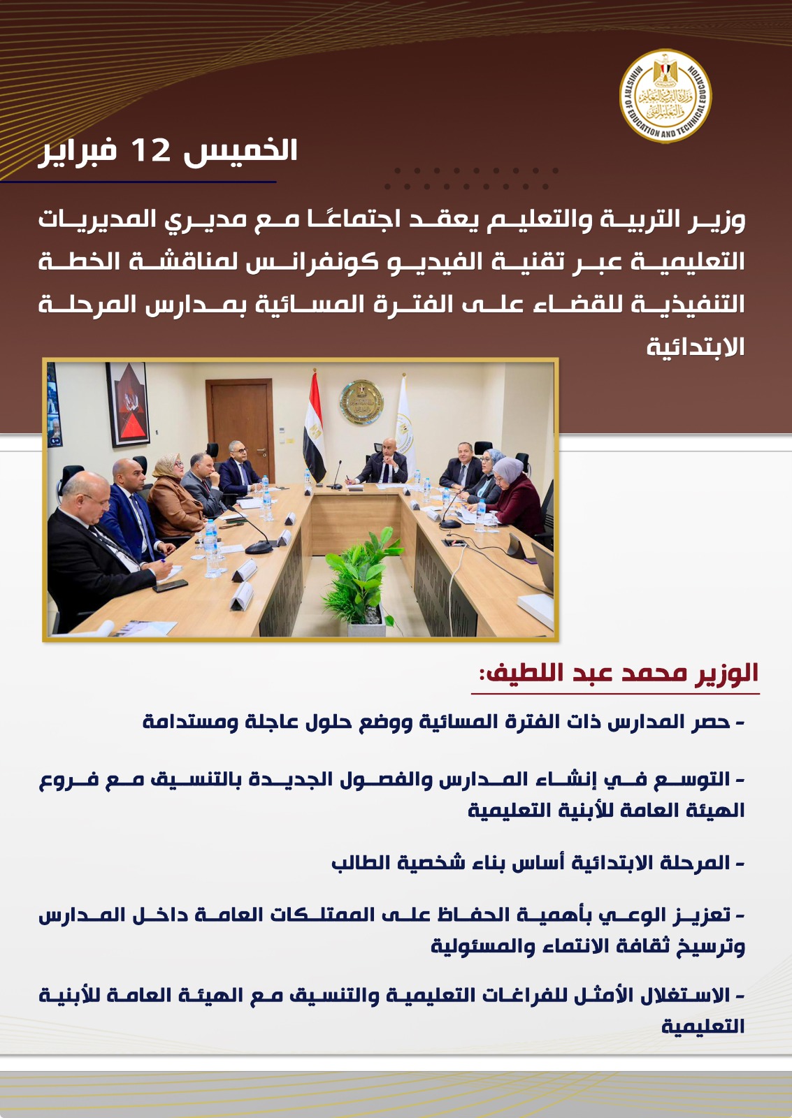 عقد السيد/ محمد عبد اللطيف، وزير التربية والتعليم والتعليم الفني، اجتماعًا عبر تقنية الفيديو كونفرانس مع مديري المديريات التعليمية على مستوى الجمهورية، وممثلى الهيئة العامة للأبنية التعليمية لمناقشة الخطة التنفيذية للقضاء على نظام الفترة المسائية بمدارس المرحلة الابتدائية، وسبل معالجتها، ووضع حلول عاجلة ومستدامة تسهم في تحسين جودة العملية التعليمية وتعزيز الانضباط داخل المدارس.