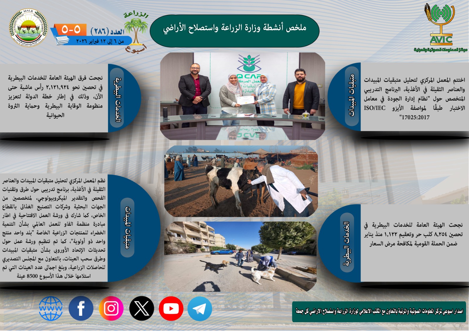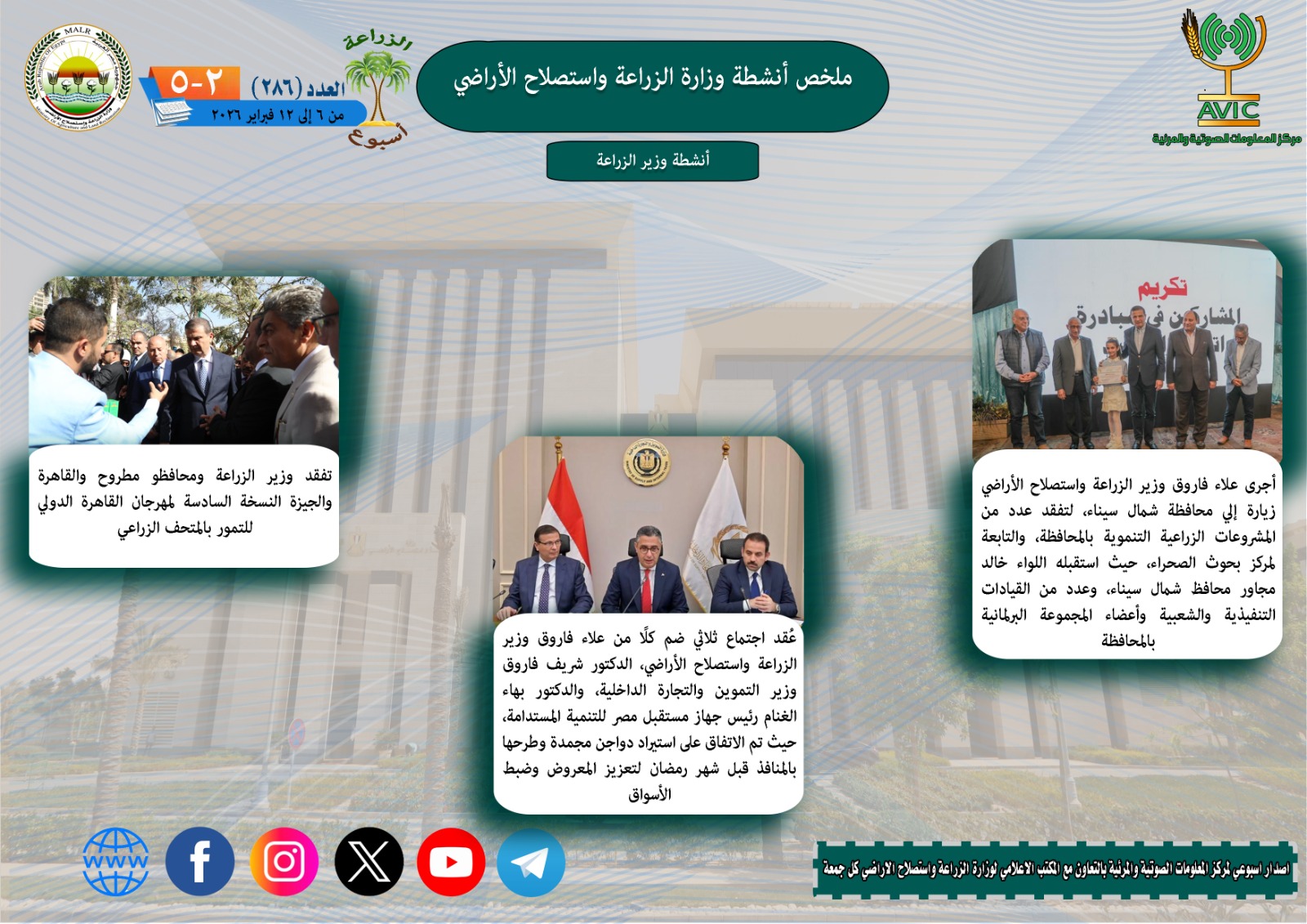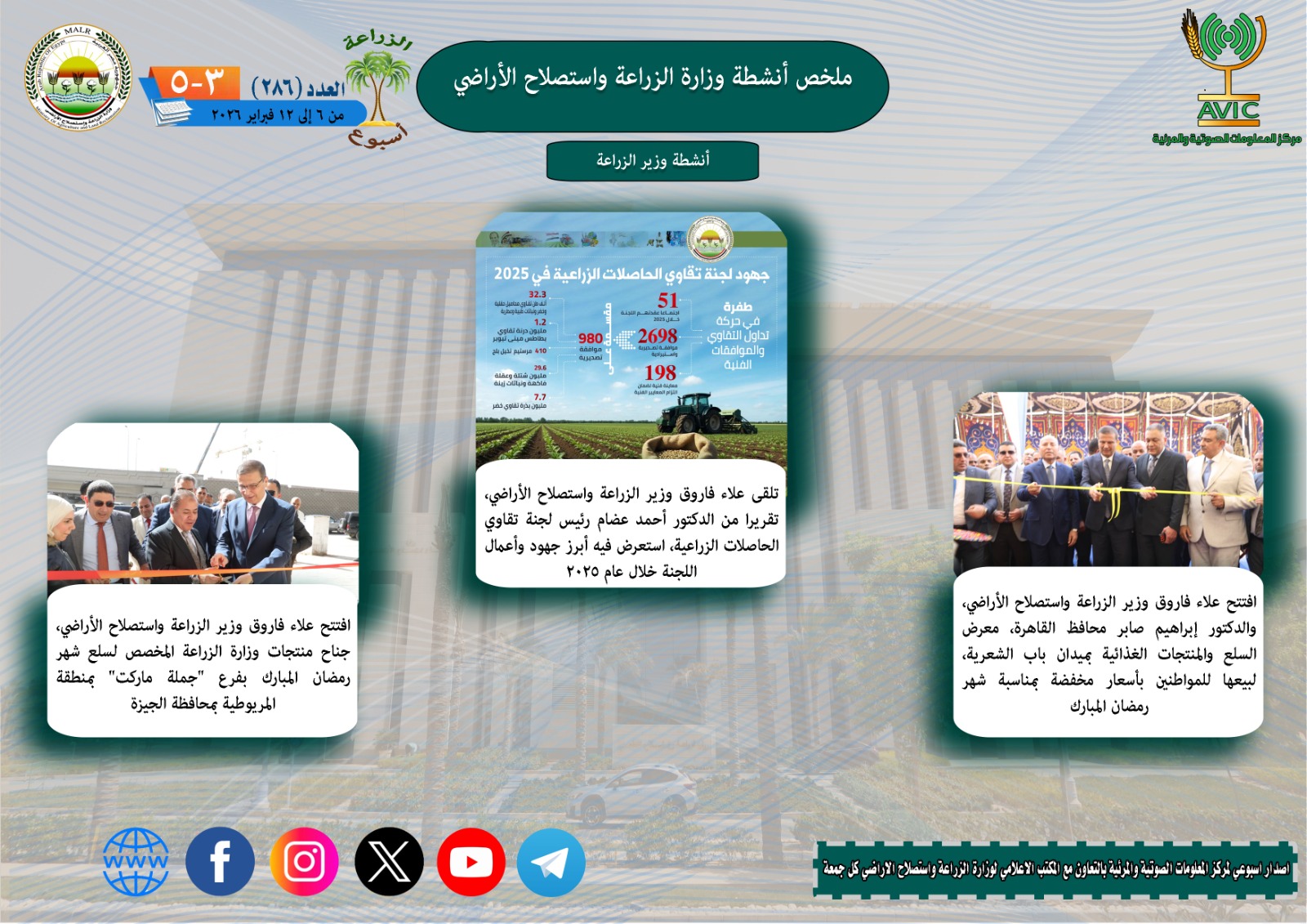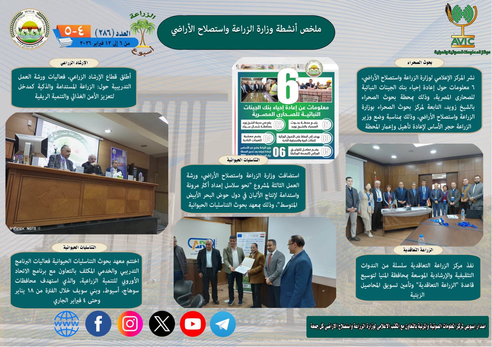 "الزراعة في اسبوع" نشرة الحصاد رقم 286 لأنشطة الوزارة في الفترة من 6 وحتى 12 فبراير الجاري| انفوجراف