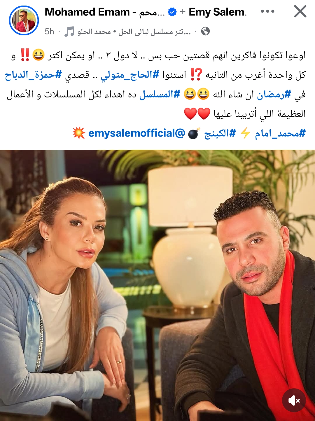 وشارك محمد إمام جمهوره صورة برفقة الفنانة إيمي سالم، من خلال حسابه الرسمي عبر موقع التواصل الاجتماعي فيسبوك، وعلق: اوعوا تكونوا فاكرين انهم قصتين حب بس.. لا دول.. او يمكن اكثر ت !! وكل واحدة أغرب من الثانيه !! استنوا الحاج متولي .. قصدي حمزة الدباح.