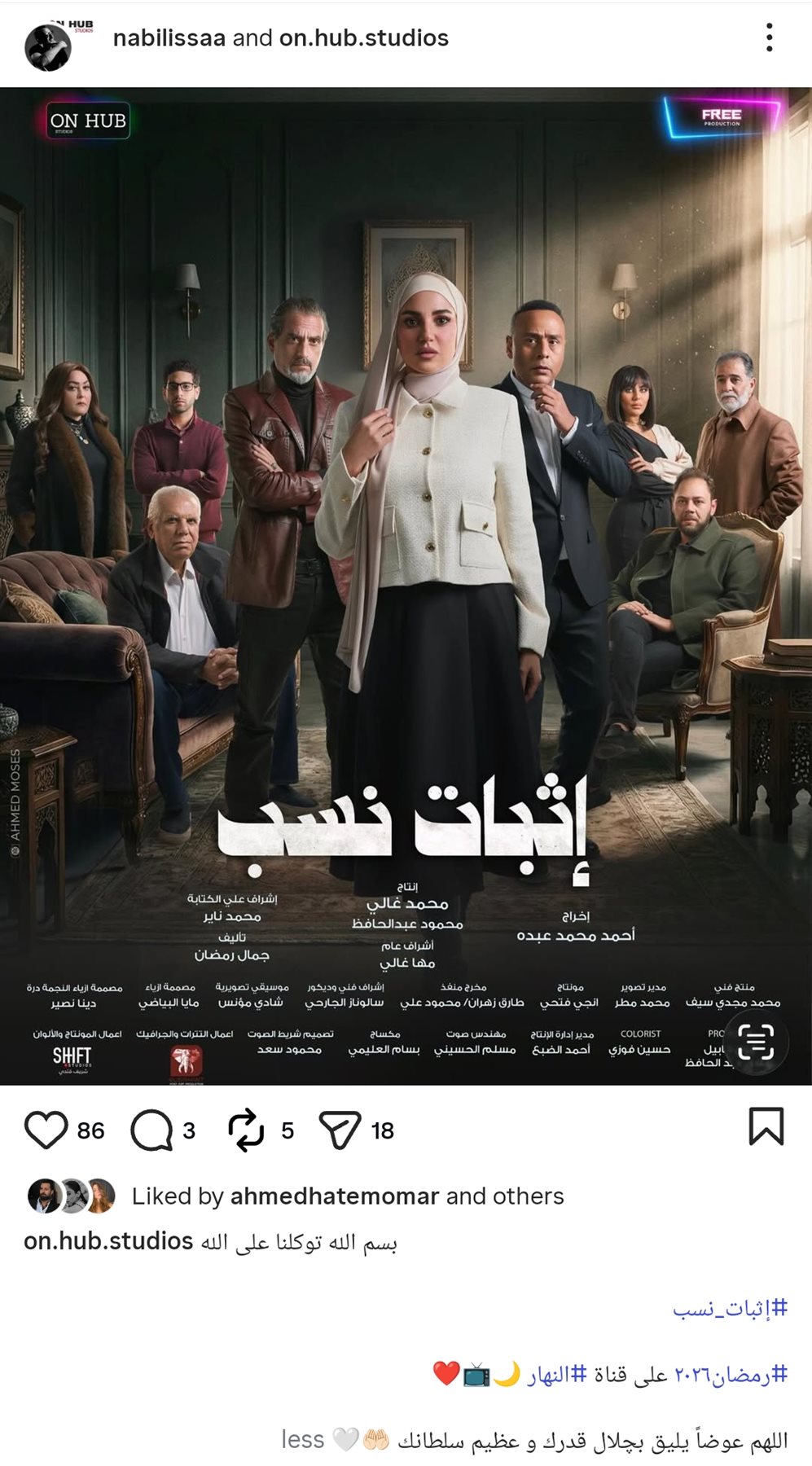 وظهرت الفنانة درة بالحجاب على بوستر العمل، وكتبت الصفحة الرسمية من خلال حسابها الرسمي عبر موقع تبادل الصور والفيديوهات القصيرة إنستجرام، قال: بسم الله توكلنا على الله.. إثبات نسب رمضان 2026 على قناة النهار.. اللهم عوضًا يليق بجلال وجهك وعظيم سلطانك.