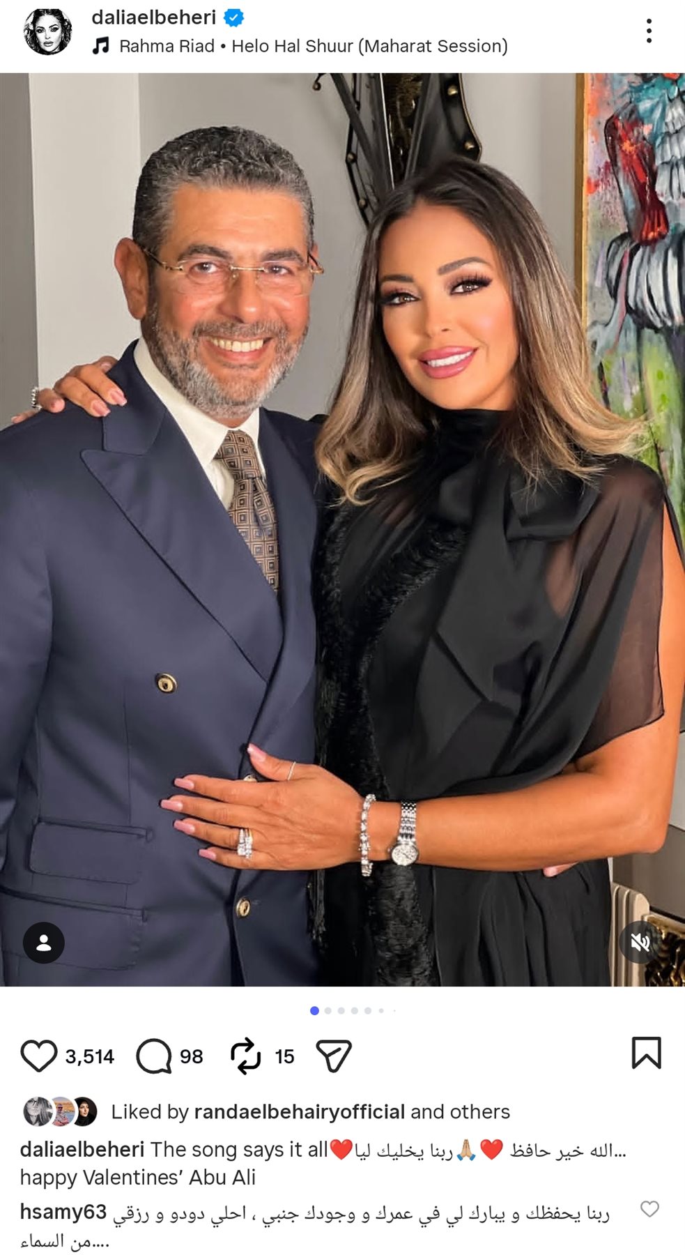 وشاركت داليا البحيري جمهورها صورا رومانسية تجمعها بزوجها، من خلال حسابه الرسمي عبر موقع تبادل الصور والفيديوهات القصيرة إنستجرام، وعلقت: الله خير حافظ.. ربنا يخليك ليا.. الأغنية تعبّر عن كل شيء.. عيد حب سعيد.