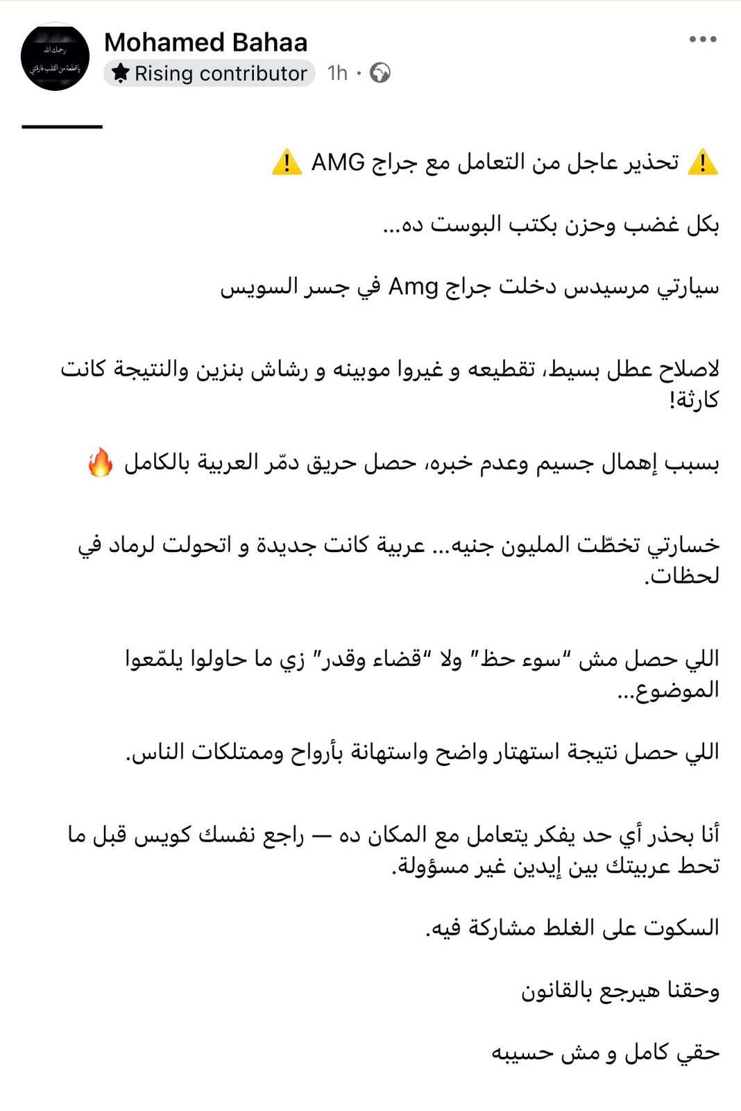 وقال مالك السيارة، عبر صفحته الشخصية، «تحذير عاجل من التعامل مع جراج AMG بكل غضب وحزن بكتب البوست ده…سيارتي مرسيدس دخلت جراج Amg في جسر السويس لاصلاح عطل بسيط، تقطيعه و غيروا موبينه و رشاش بنزين والنتيجة كانت كارثة!».