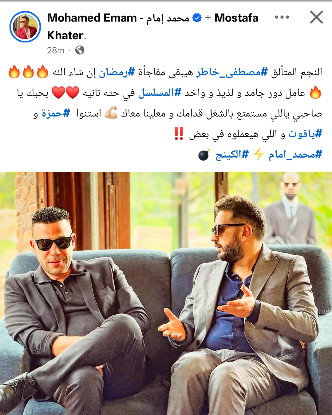 وشارك محمد إمام جمهوره صورة من كواليس العمل، من خلال حسابه الرسمي عبر موقع التواصل الاجتماعي فيسبوك، وعلق: النجم المتألق مصطفى خاطر هيبقى مفاجأة رمضان إن شاء الله عامل دور جامد و لذيذ و واخد المسلسل في حته تانيه بحبك يا صاحبي ياللي مستمتع بالشغل قدامك و معلينا معاك استنوا حمزة و ياقوت و اللي هيعملوه في بعض.