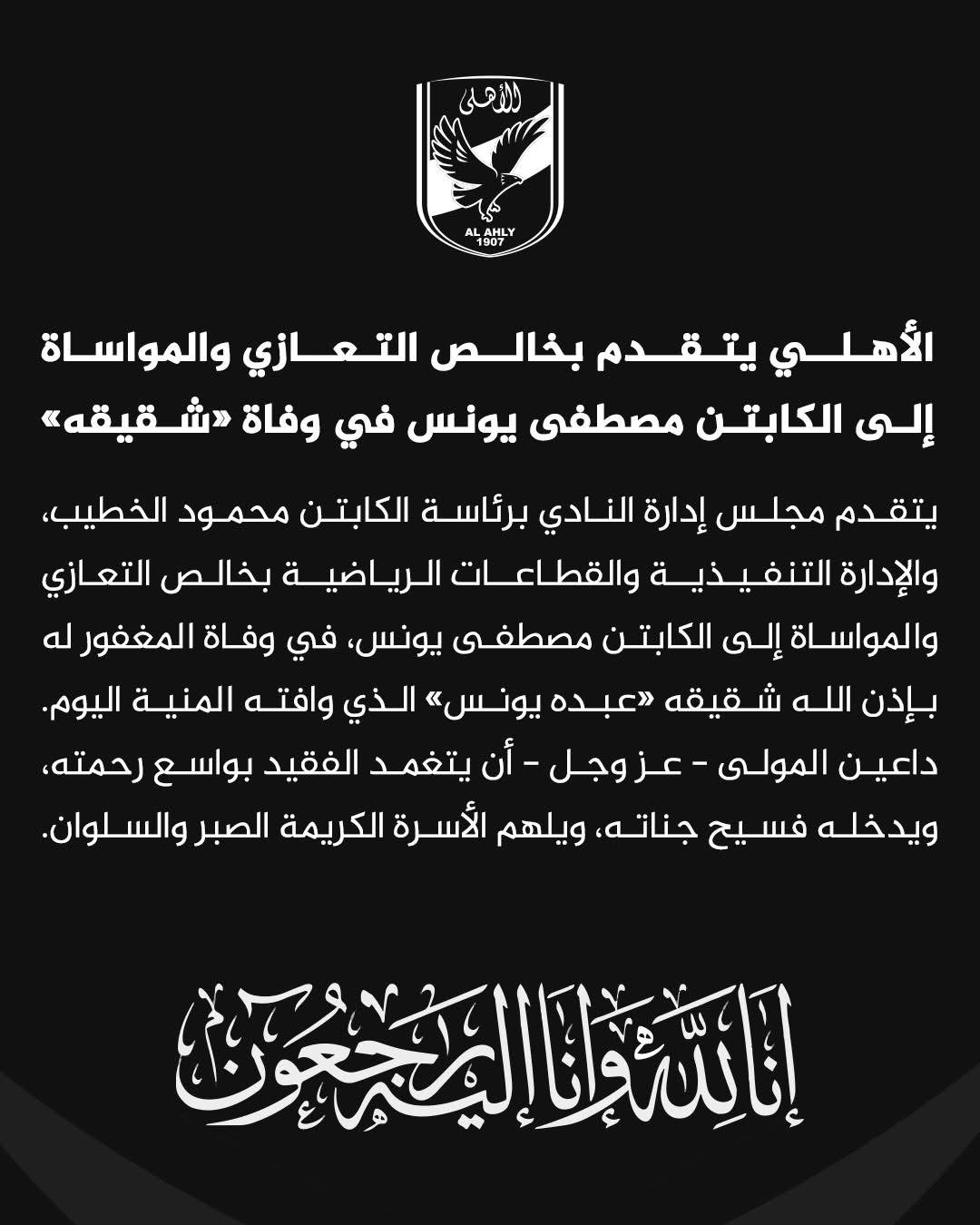 قدّم مجلس إدارة النادي الأهلي برئاسة الكابتن محمود الخطيب، إلى جانب الإدارة التنفيذية والقطاعات الرياضية، خالص التعازي والمواساة إلى الكابتن مصطفى يونس في وفاة شقيقه عبده يونس، الذي وافته المنية اليوم السبت.