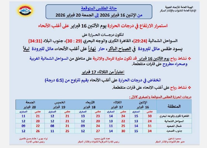 حالة الطقس غدًا الاثنين 16 فبراير.. تشهد توقعات الأرصاد الجوية اهتمامًا متزايدًا من المواطنين مع التقلبات التي تشهدها البلاد خلال هذه الفترة، حيث أعلنت الجهات المختصة تفاصيل حالة الطقس غدًا الاثنين 16 فبراير 2026، والتي تشير إلى استمرار الارتفاع في درجات الحرارة على أغلب الأنحاء قبل أن تعاود الانخفاض مرة أخرى بدءًا من الثلاثاء وسط تحذيرات من نشاط الرياح في بعض المناطق.