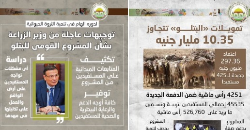 وافق مجلس إدارة المشروع القومى لاحياء البتلو برئاسة علاء فاروق وزير الزراعة واستصلاح الأراضى، على إعتماد مبلغ 297 مليوناً و360 ألف جنيه، تمويلا جديدا لـ 425 مستفيدا من صغار المربين وشباب الخريجين، بإجمالى عدد رؤوس ماشية 4251 رأس، وذلك في إطار المبادرة الرئاسية «حياة كريمة» التي أطلقها الرئيس عبد الفتاح السيسي، لتطوير الريف المصري ورفع مستوى صغار المزارعين والمربين.