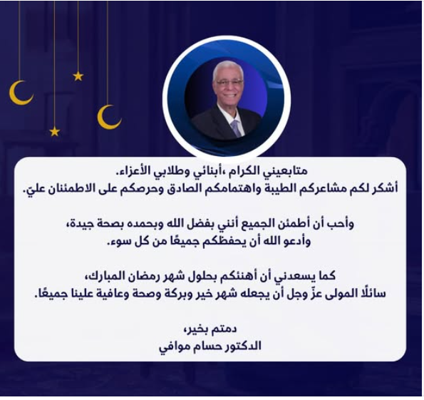 وطمأن الدكتور حسام موافي متابعيه وطلابه ومحبيه على حالته الصحية، و قال: " متابعيني الكرام ،أبنائي وطلابي الأعزاء، أشكر لكم مشاعركم الطيبة واهتمامكم الصادق وحرصكم على الاطمئنان عليّ. وأحب أن أطمئن الجميع أنني بفضل الله وبحمده بصحة جيدة.