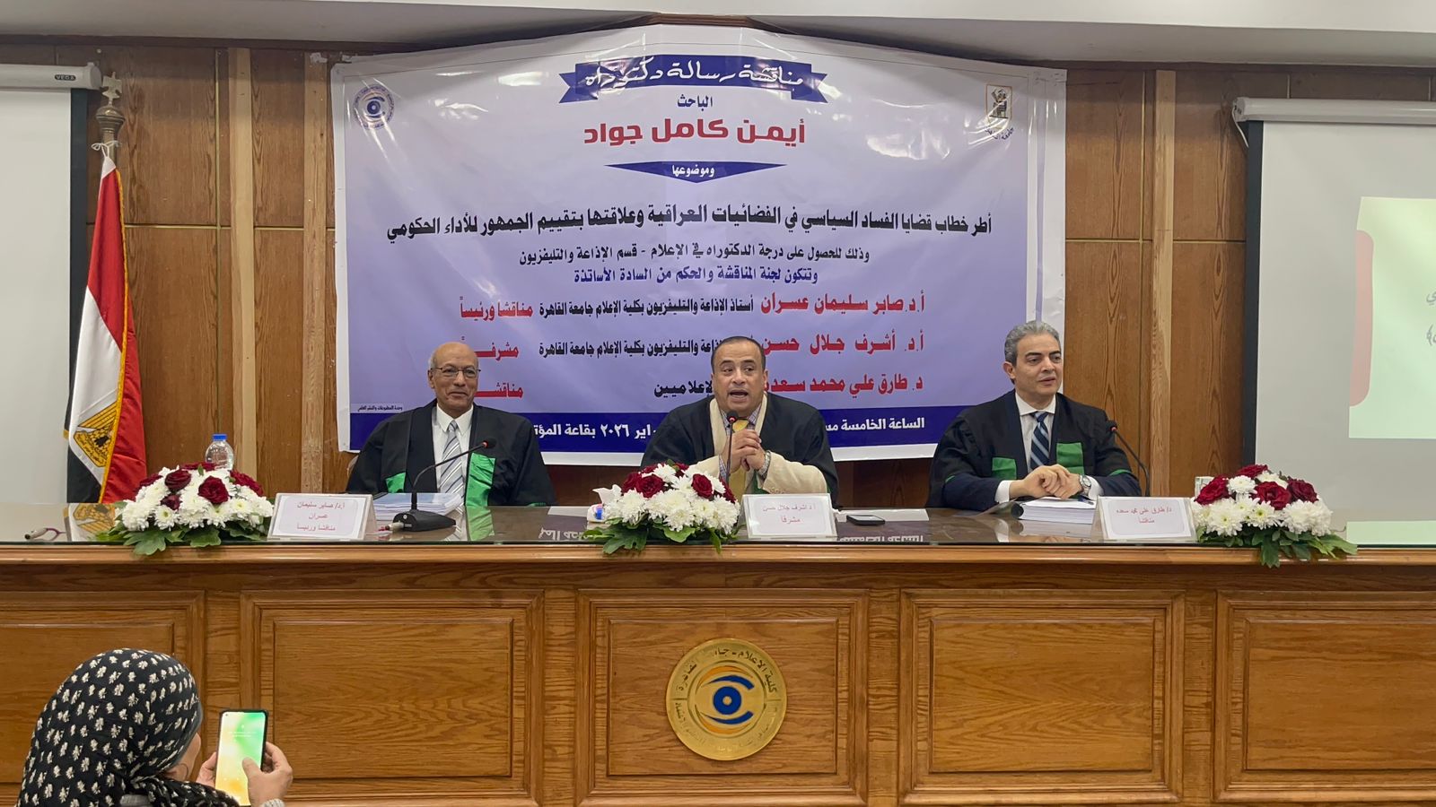 ناقش اليوم النائب الدكتور طارق سعده – نقيب الإعلاميين رسالة الدكتوراه المقدمة من الباحث أيمن كامل جواد، بكلية الإعلام – جامعة القاهرة، والتي جاءت بعنوان «أطر خطاب قضايا الفساد السياسي في الفضائيات العراقية وعلاقتها بتقييم الجمهور للأداء الحكومي»، وذلك بحضور كوكبة من أساتذة وخبراء الإعلام.