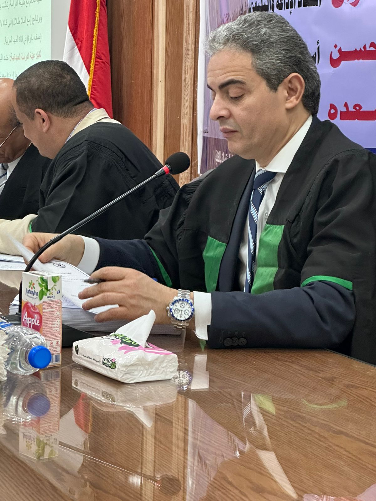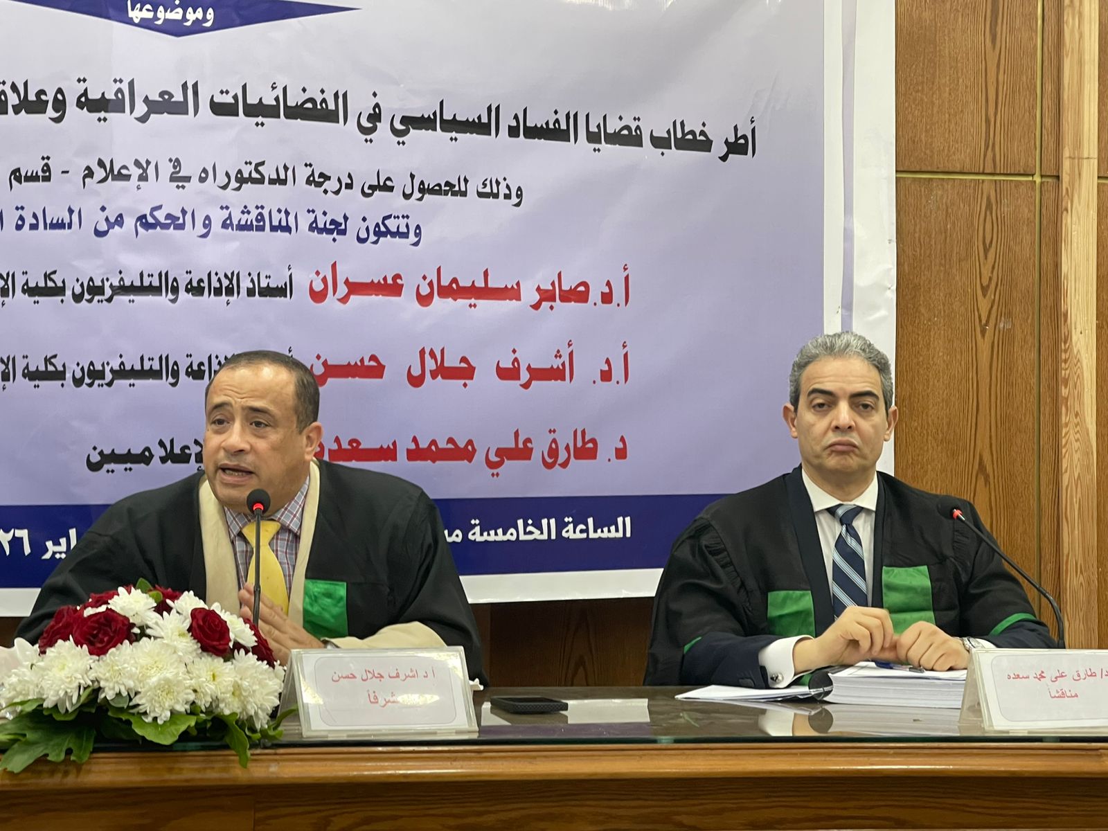 وفيما ضمّت لجنة المناقشة والحُكم كلًّا من النائب الدكتور طارق سعده – نقيب الإعلاميين، مناقشًا ومحكّمًا، والأستاذ الدكتور أشرف جلال،مناقشًا ومحكّمًا، والأستاذ الدكتور صابر سليمان عسران – أستاذ الإذاعة والتليفزيون بكلية الإعلام جامعة القاهرة مناقشًا ومحكّمًا.