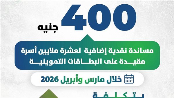 وأوضح الوزير أن الحزمة الجديدة تتضمن مساندة نقدية مباشرة للفئات المستحقة لتحسين أحوالهم بمناسبة شهر رمضان وعيد الفطر، لافتًا إلى أن هناك مساندة نقدية إضافية بقيمة ٤٠٠ جنيه لعشرة ملايين أسرة مقيدة على البطاقات التموينية خلال شهري مارس وأبريل ٢٠٢٦، بتكلفة إجمالية ٨ مليارات جنيه، ومساندة نقدية إضافية أيضًا بقيمة ٤٠٠ جنيه خلال "رمضان" و"العيد" لـ ٥,٢ مليون أسرة مستفيدة من برنامج "تكافل وكرامة" بتكلفة إجمالية ٤ مليارات جنيه، وكذلك مساندة نقدية إضافية بـ ٣٠٠ جنيه خلال رمضان والعيد لـ ٤٥ ألفًا من المستفيدين بمعاش الطفل والرائدات الريفيات.