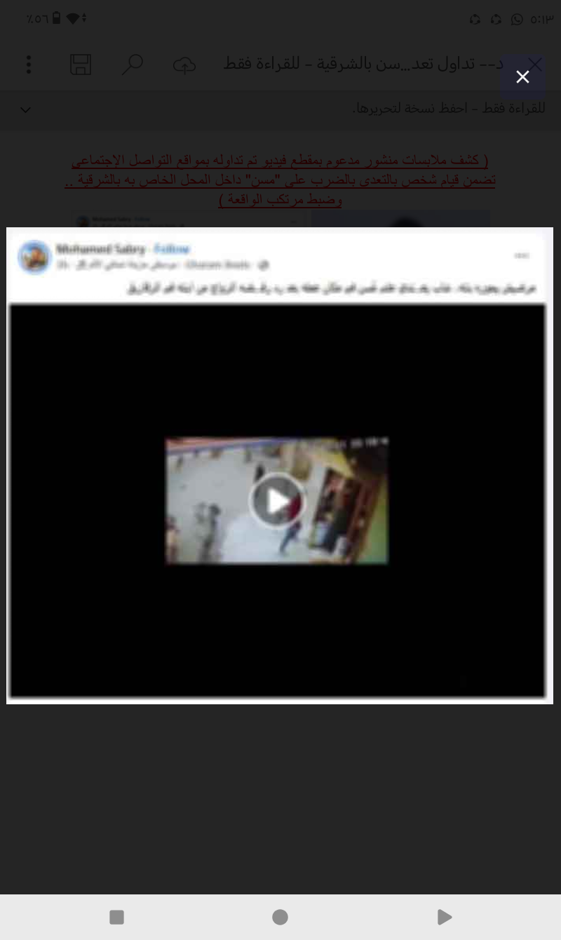 جاء ذلك فى إطار كشف ملابسات منشور مدعوم بمقطع فيديو تم تداوله بمواقع التواصل الإجتماعى تضمن قيام شخص بالتعدى بالضرب على "مسن" داخل المحل الخاص به بالشرقية.