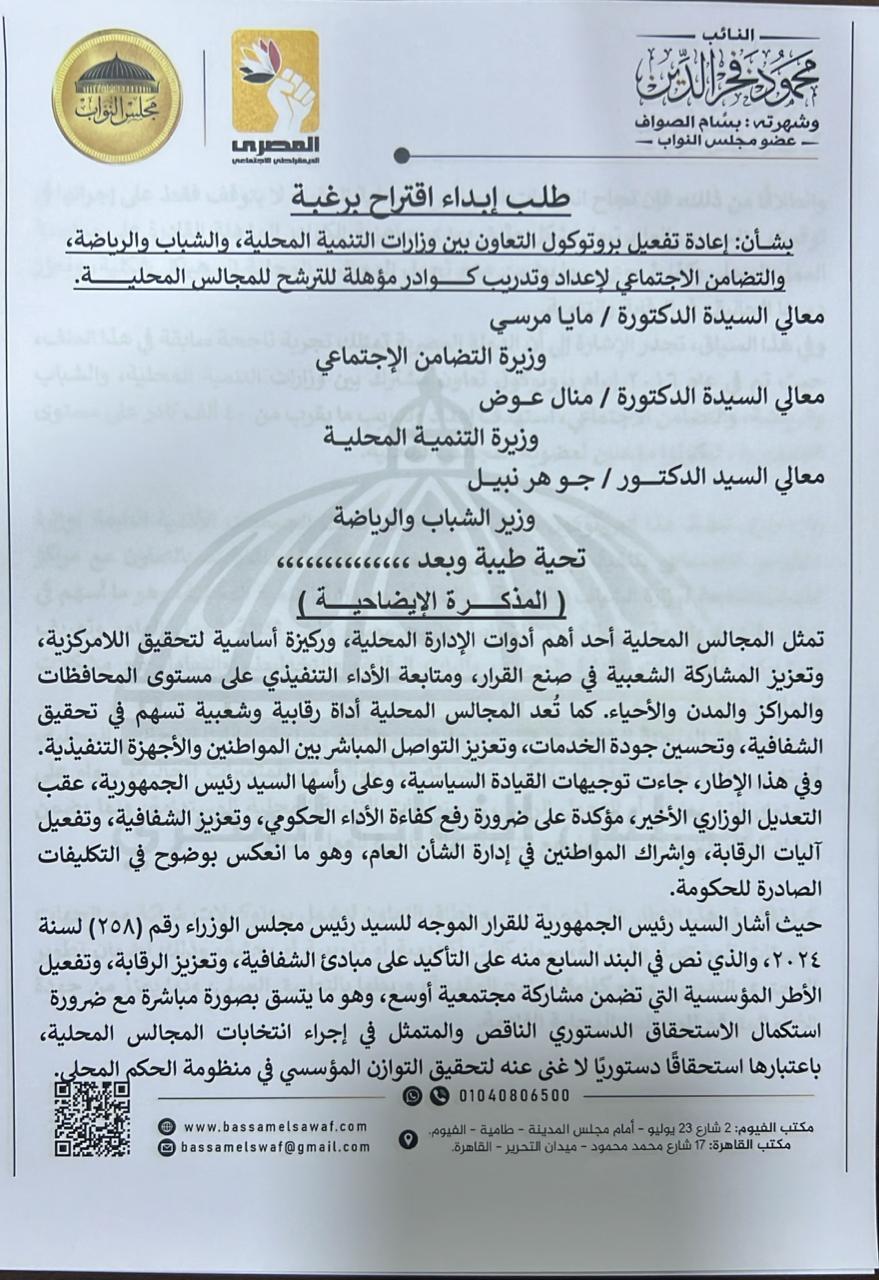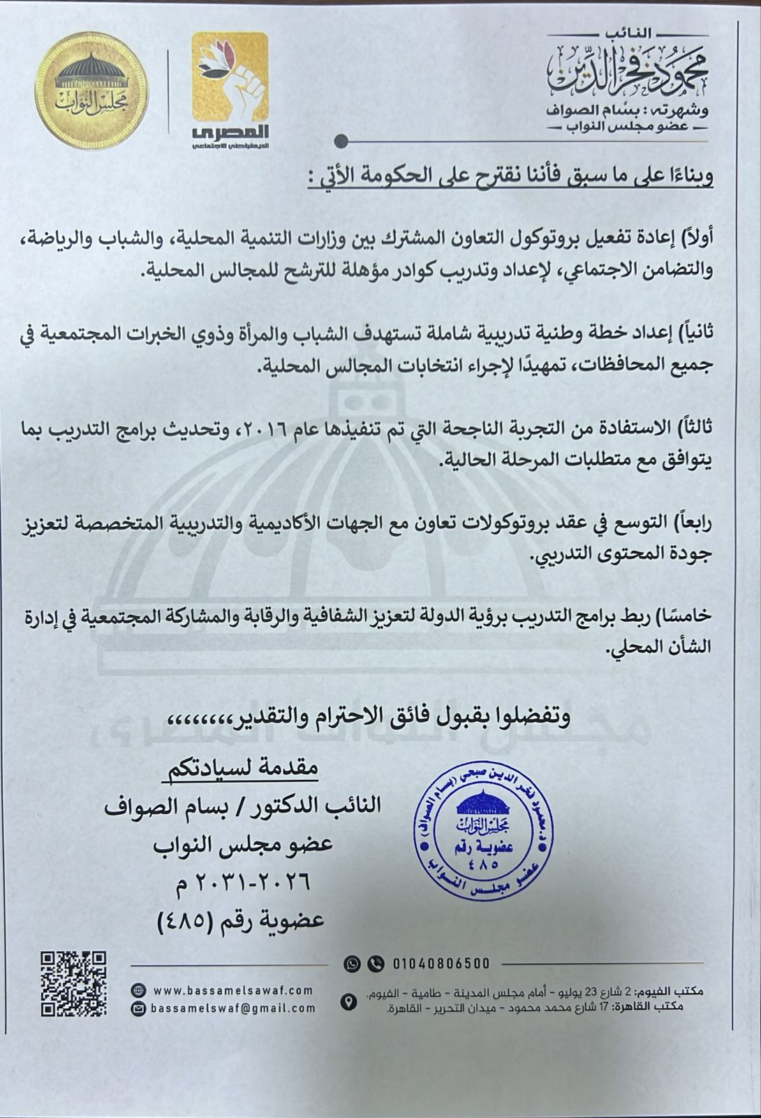تقدم النائب بسام الصواف، عضو مجلس النواب عن الحزب المصري الديمقراطي الاجتماعي، باقتراح برغبة موجّه إلى وزيرة التضامن الاجتماعي، ووزير الشباب والرياضة، ووزيرة التنمية المحلية، بشأن إعادة تفعيل بروتوكول التعاون المشترك بين الوزارات الثلاث لإعداد وتدريب كوادر مؤهلة للترشح لعضوية المجالس المحلية.