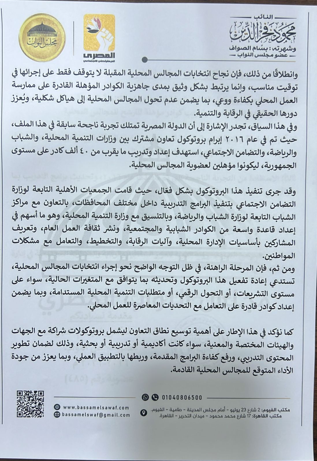 وأكد النائب أن المرحلة الراهنة، في ظل التوجه نحو إجراء انتخابات المجالس المحلية، تستدعي إعادة تفعيل البروتوكول وتحديثه بما يتوافق مع المتغيرات التشريعية والتحول الرقمي ومتطلبات التنمية المحلية المستدامة، لضمان إعداد كوادر قادرة على ممارسة العمل المحلي بكفاءة ووعي.