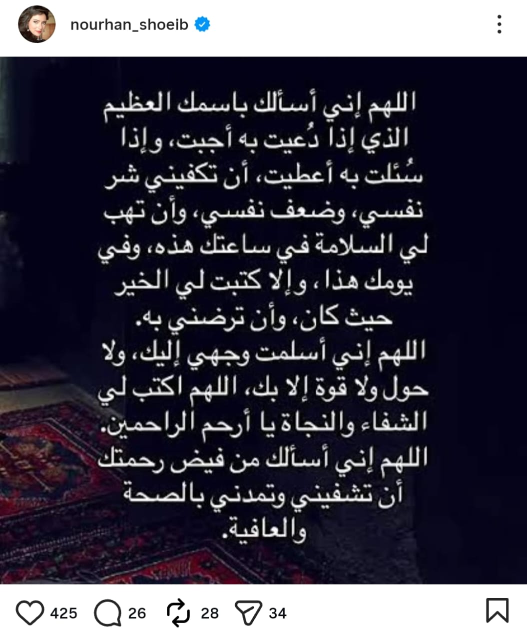 وقامت نورهان شعيب بالدعاء لنفسها، حيث كتبت من خلال حسابها الرسمي عبر موقع تبادل الصور والفيديوهات القصيرة إنستجرام، قالت: «اللهم إني أسألك باسمك العظيم الذي إذا دعيت به أجبت، وإذا سئلت به أعطيت، أن تكفيني شر نفسي، وضعف نفسي، وأن تهب لي السلامة في ساعتك هذه، وفي يومك هذا، وإلا كتبت لي الخير حيث كان، وأن ترضني به. اللهم إني أسلمت وجهي إليك، ولا حول ولا قوة إلا بك، اللهم اكتب لي الشفاء والنجاة يا أرحم الراحمين. اللهم إني أسألك من فيض رحمتك أن تشفيني وتمدني بالصحة والعافية».