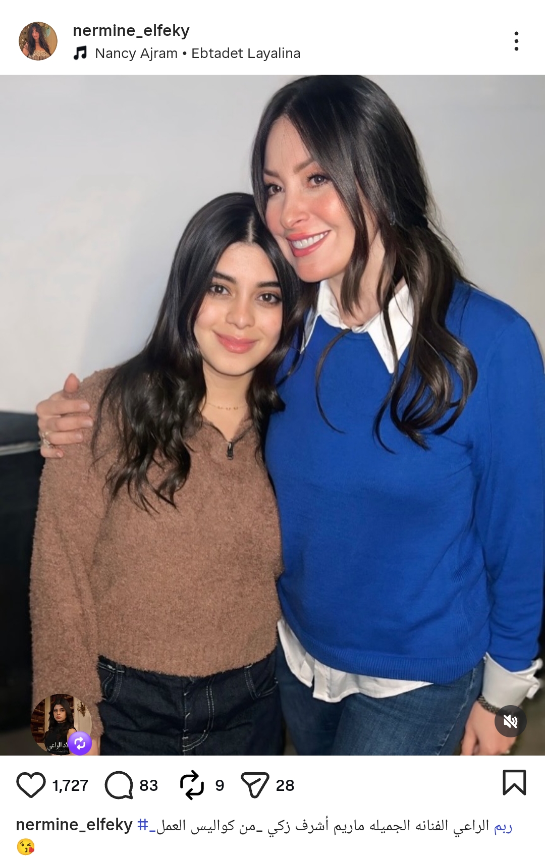 وكتبت نيرمين الفقي من خلال حسابها الرسمي عبر موقع تبادل الصور والفيديوهات القصيرة إنستجرام، قالت: «ريم الراعي الفنانة الجميلة مريم أشرف زكي من كواليس العمل».