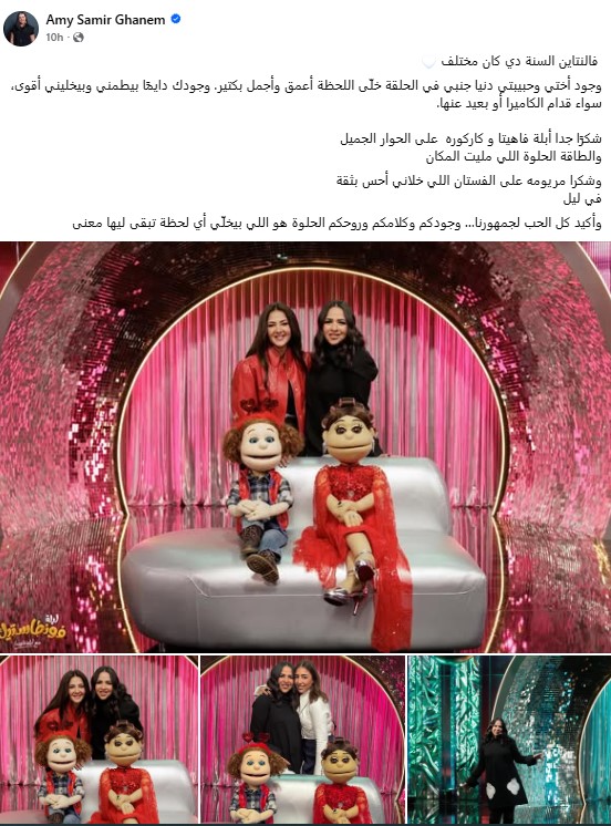 وجهت الفنانة إيمي سمير غانم رسالة شكر لـ شقيقتها دنيا وأبلة فاهيتا، وذلك بعد لقائهما في برنامج ليلة فونطاستيك يوم الفالنتين 14 فبراير.