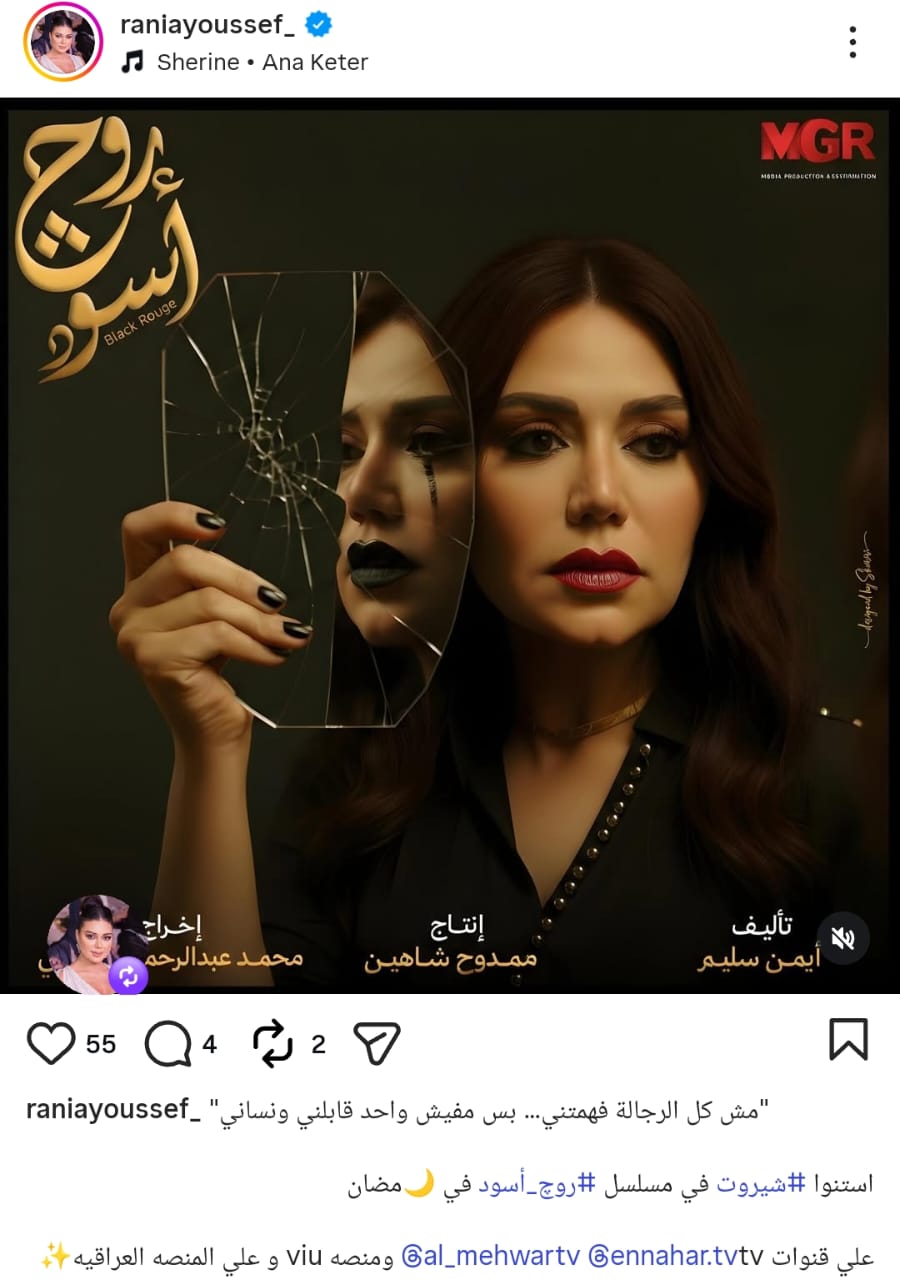 أضافت: «استنوا شيروت في مسلسل روج أسود في رمضان على قنوات النهار، والمحور، ومنصة فيو، والمنصة العراقية».