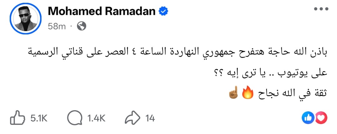 وكتب محمد رمضان من خلال حسابه الرسمي عبر موقع التواصل الاجتماعي فيسبوك، قال: «باذن الله حاجة هتفرح جمهوري النهاردة الساعة ٤ العصر على قناتي الرسمية على يوتيوب.. يا ترى إيه ؟؟.. ثقة في الله نجاح».