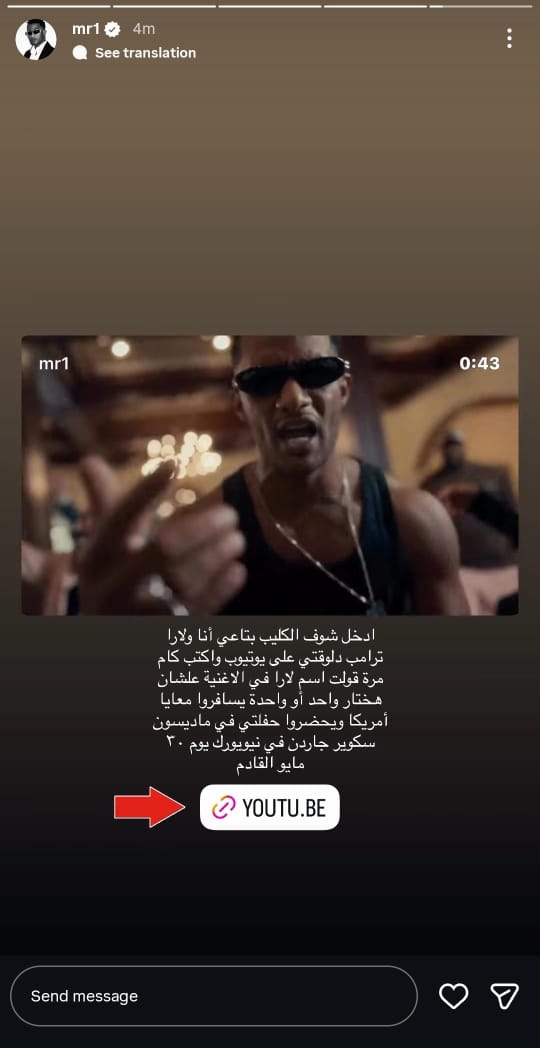 وكتب محمد رمضان من خلال حسابه الرسمي عبر موقع تبادل الصور والفيديوهات القصيرة «إنستجرام»، قال: «ادخل شوف الكليب بتاعي أنا ولارا ترامب دلوقتي على يوتيوب، واكتب كام مرة قولت اسم لارا في الأغنية عشان هختار واحد أو واحدة يسافروا معايا أمريكا ويحضروا حفلتي في ماديسون سكوير جاردن في نيويورك يوم 30 مايو القادم».