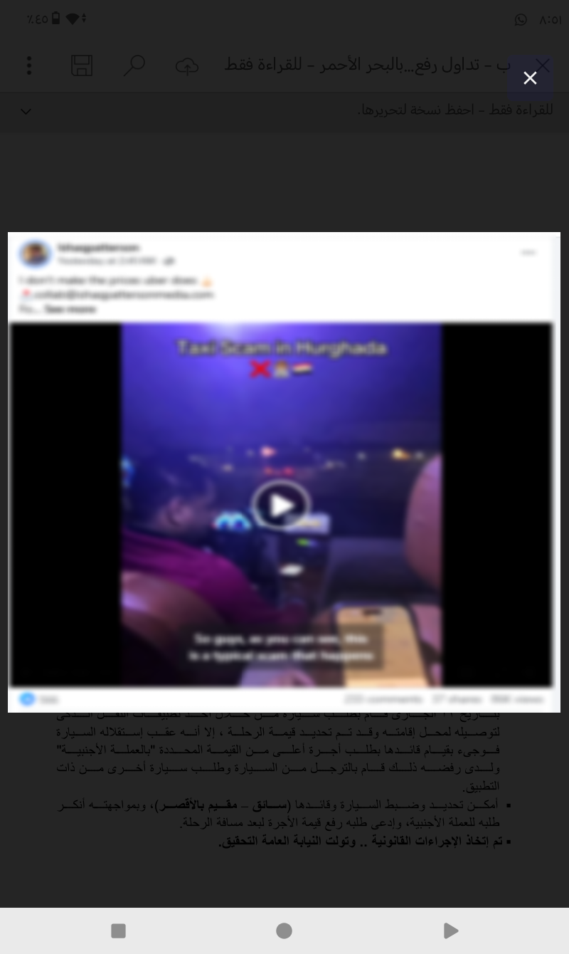 جاء ذلك فى إطار كشف ملابسات منشور مدعوم بمقطع فيديو تم تداوله بمواقع التواصل الإجتماعى تضمن تضرر أحد الأشخاص "يحمل جنسية إحدى الدول" من قيام قائد سيارة "تابعة لإحدى شركات النقل الذكى" برفع تعريفة الركوب ومطالبته سدادها بالعملة الأجنبية بالبحر الأحمر.