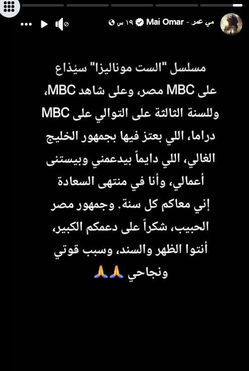 وكتبت مي من خلال خاصية الاستوري علي حسابها الرسمي "فيس بوك"" مسلسل الست موناليزا سيُذاع على MBC مصر، وعلى شاهد MBC، وللسنة الثالثة على التوالي على MBC دراما، اللي بعتز فيها بجمهور الخليج الغالي، اللي دايمًا بيدعمني وبيستني أعمالي".
