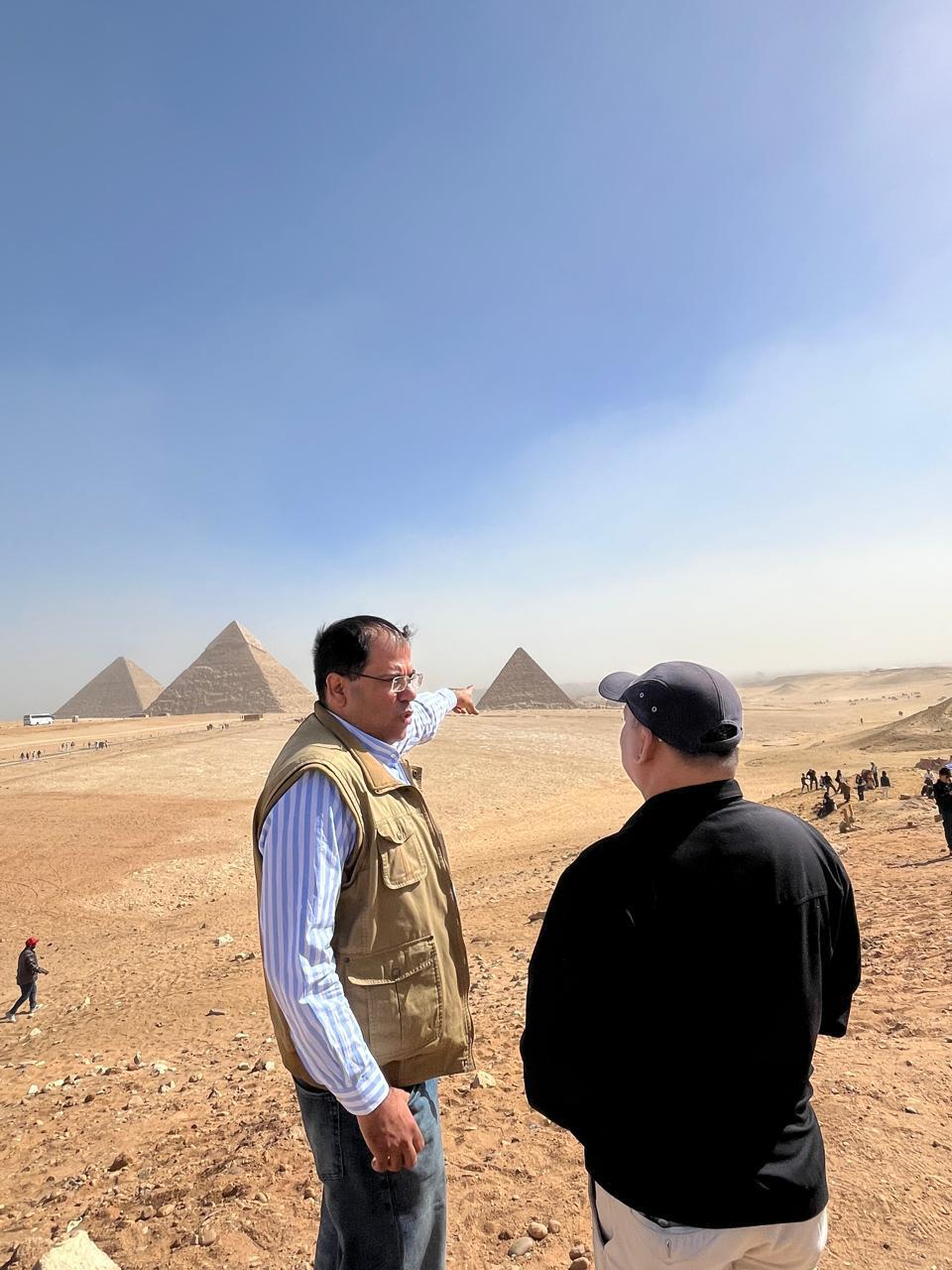 واستمع الضيف إلى شرح د. عبد البصير عن الهرم الأكبر وتفاصيل الجبانة الشرقية حيث تم الكشف عن حفر مراكب الملك وأهرامات الملكات، إلى جانب استراحة الملك فاروق بالهرم، وتطور مفهوم العمارة الجنائزية وعناصر المجموعة الهرمية بوصفها مشروعًا متكاملًا يجمع بين العقيدة والفن والهندسة، كما قدم له عرضًا علميًا متكاملًا لعناصر المنطقة الأثرية بالهرم، موضحًا السياق التاريخي والديني لبناء الأهرامات وأحدث النظريات الأثرية المتعلقة بطرق التشييد.