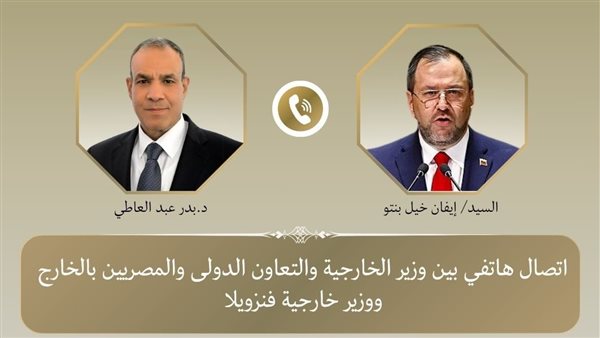 تلقى د. بدر عبد العاطي وزير الخارجية والتعاون الدولي والمصريين بالخارج، يوم الثلاثاء ١٧ فبراير، اتصالاً هاتفياً من"إيفان خيل بنتو" وزير خارجية فنزويلا، حيث تناول الاتصال العلاقات الثنائية بين البلدين، إلى جانب التشاور حول عدد من القضايا الإقليمية والدولية ذات الاهتمام المشترك.