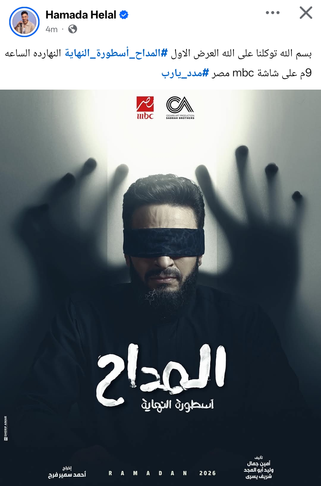 وكتب حمادة هلال من خلال حسابه الرسمي عبر موقع التواصل الاجتماعي فيسبوك: بسم الله توكلنا على الله العرض الأول المداح أسطورة النهاية النهاردة الساعة 9 م على شاشة mbc مصر.. مدد يارب.