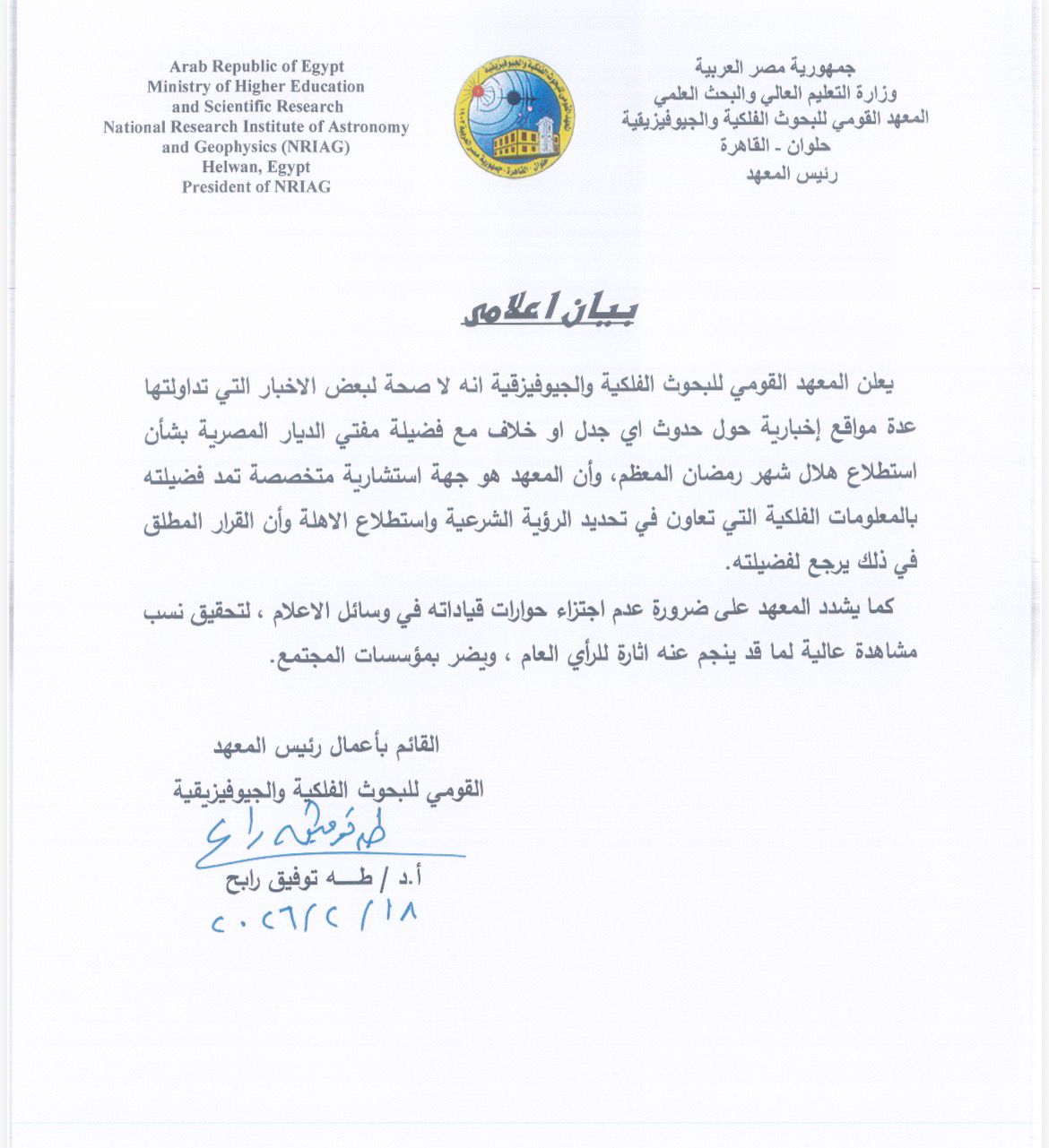 أصدر الدكتور طه توفيق رابح القائم بأعمال رئيس المعهد القومي للبحوث الفلكية والجيوفيزيقية، بيانا إعلاميا رسميا اليوم أنه لا صحة لبعض الأخبار التي تداولتها عدة مواقع إخبارية حول حدوث اي جدل او خلاف مع فضيلة مفتي الديار المصرية بشأن استطلاع هلال شهر رمضان المعظم.
