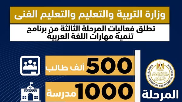 فى إطار توجيهات محمد عبداللطيف وزير التربية والتعليم والتعليم الفنى، تعلن وزارة التربية والتعليم والتعليم الفنى انطلاق المرحلة الثالثة من البرنامج القومى لتنمية مهارات اللغة العربية .