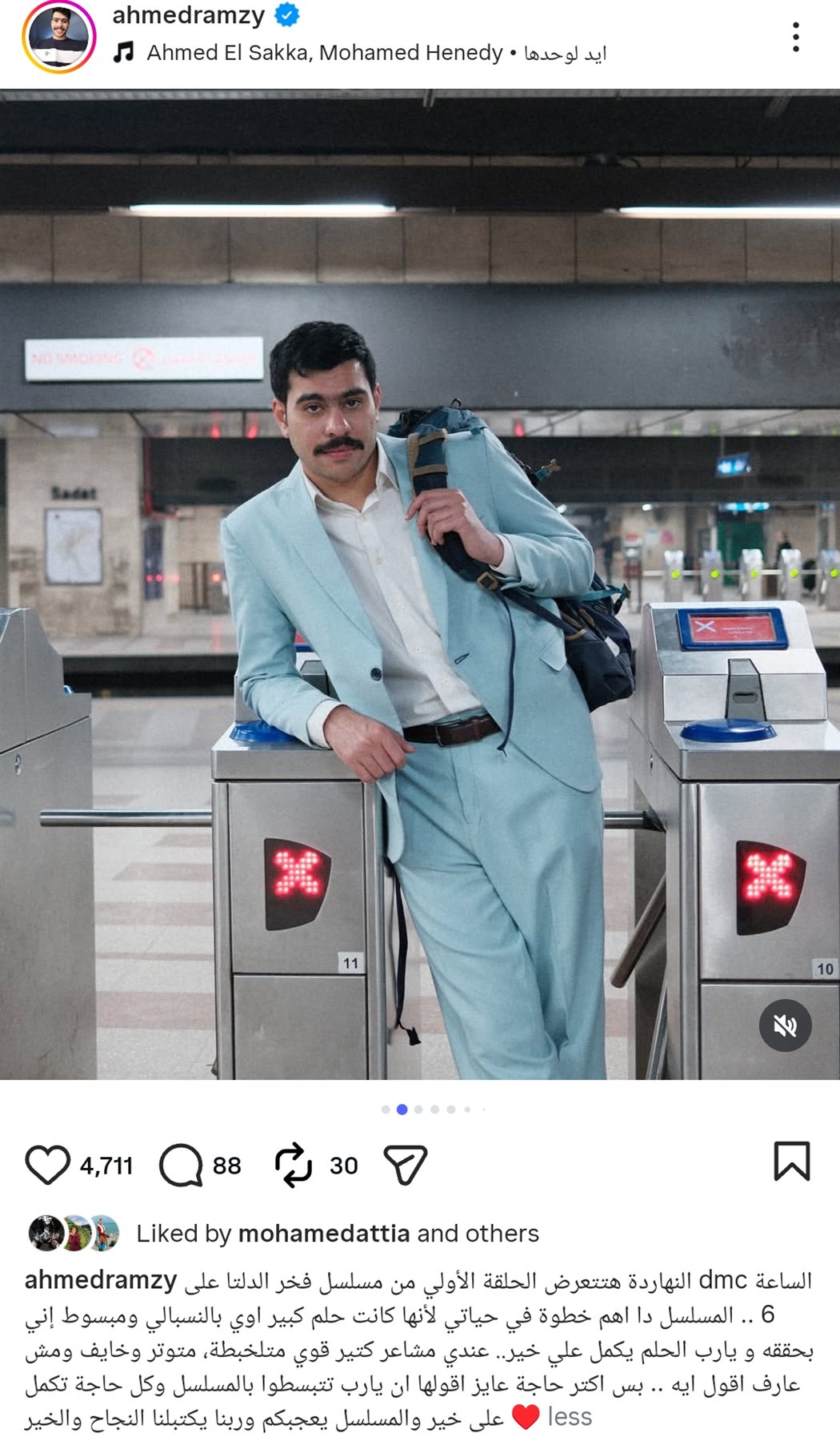 وكتب أحمد رمزي من خلال حسابه الرسمي عبر موقع تبادل الصور والفيديوهات القصيرة إنستجرام، قال: النهاردة هتتعرض الحلقة الأولي من مسلسل فخر الدلتا على dmc الساعة 6.. المسلسل دا اهم خطوة في حياتي لأنها كانت حلم كبير اوي بالنسبالي ومبسوط إني بحققه و يارب الحلم يكمل علي خير.