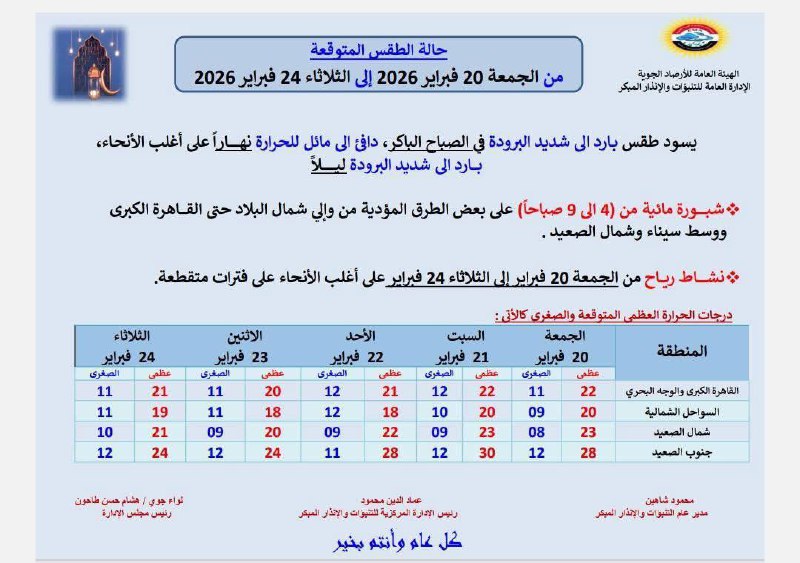 تشير توقعات الهيئة إلى استمرار نفس الأجواء العامة خلال الفترة من الجمعة 20 فبراير وحتى الثلاثاء 24 فبراير 2026، حيث يسود طقس معتدل نهارًا يميل للدفء، مع انخفاض ملحوظ في درجات الحرارة ليلًا.