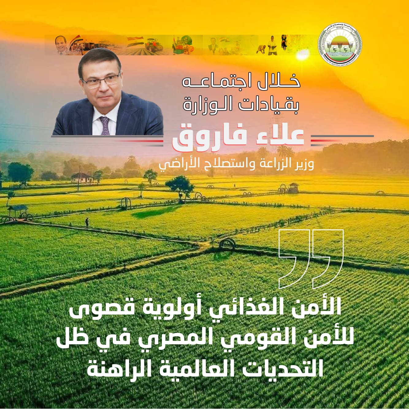 عقد علاء فاروق، وزير الزراعة واستصلاح الأراضي، اجتماعاً موسعاً مع قيادات الوزارة ورؤساء الهيئات والقطاعات التابعة، بحضور المهندس مصطفى الصياد نائب وزير الزراعة، لوضع خطط عمل المرحلة المقبلة ومتابعة التكليفات العاجلة للنهوض بالقطاع الزراعي، مؤكداً أن الأمن الغذائي هو أولوية قصوى للأمن القومي المصري في ظل التحديات العالمية الراهنة.