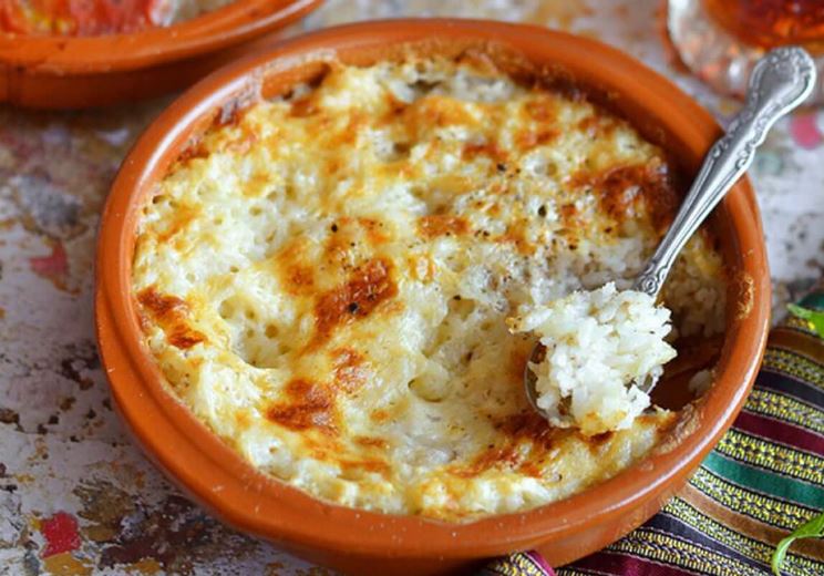 يُسخن الحليب على النار حتى يبدأ بالغليان، ثم يُضاف إليه ربع كوب من الماء لمنع الفوران أثناء الطهي في الفرن. بعد ذلك، يُسكب الحليب الساخن على الأرز ويُقلب مرة واحدة.