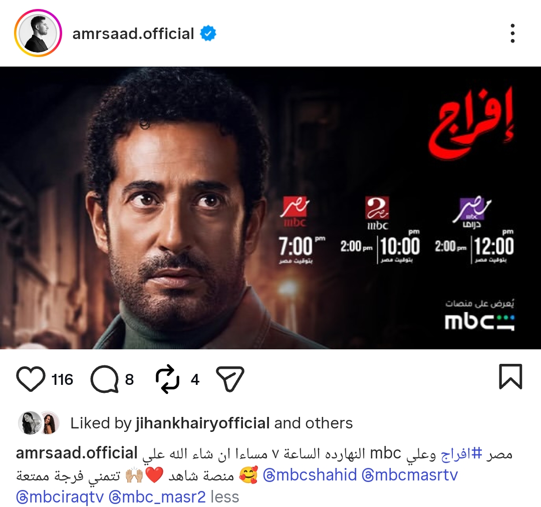 وكتب عمرو سعد من خلال حسابه الرسمي عبر موقع تبادل الصور والفيديوهات القصيرة إنستجرام، قال: «مسلسل افراج على mbc مصر انهارده الساعة 7 مساء ان شاء الله على منصة شاهد.. نتمنى فرجة ممتعة».