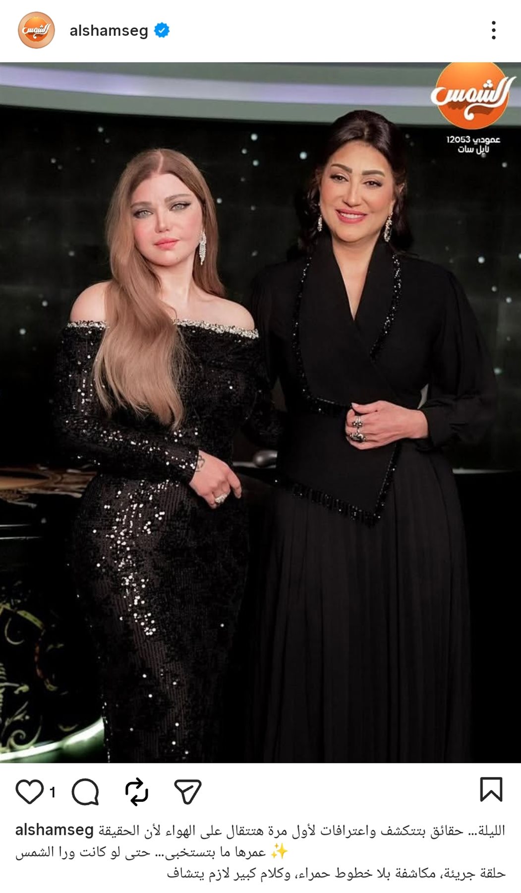 وكتبت الصفحة الرسمية لـ «قناة الشمس» من خلال موقع تبادل الصور والفيديوهات القصيرة «إنستجرام»: «الليلة.. حقائق بتتكشف واعترافات لأول مرة هتتقال على الهواء لأن الحقيقة عمرها ما بتستخبى.. حتى لو كانت ورا الشمس».