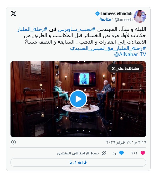 وقالت الحديدى عبر حسابها بمنصة «إكس»: «الليلة وغداً.. المهندس نجيب ساويرس فى رحلة المليار حكايات لأول مرة عن الخسائر قبل المكاسب والطريق من الاتصالات إلى العقارات والذهب. السابعة والنصف مساءً».
