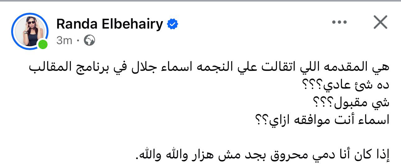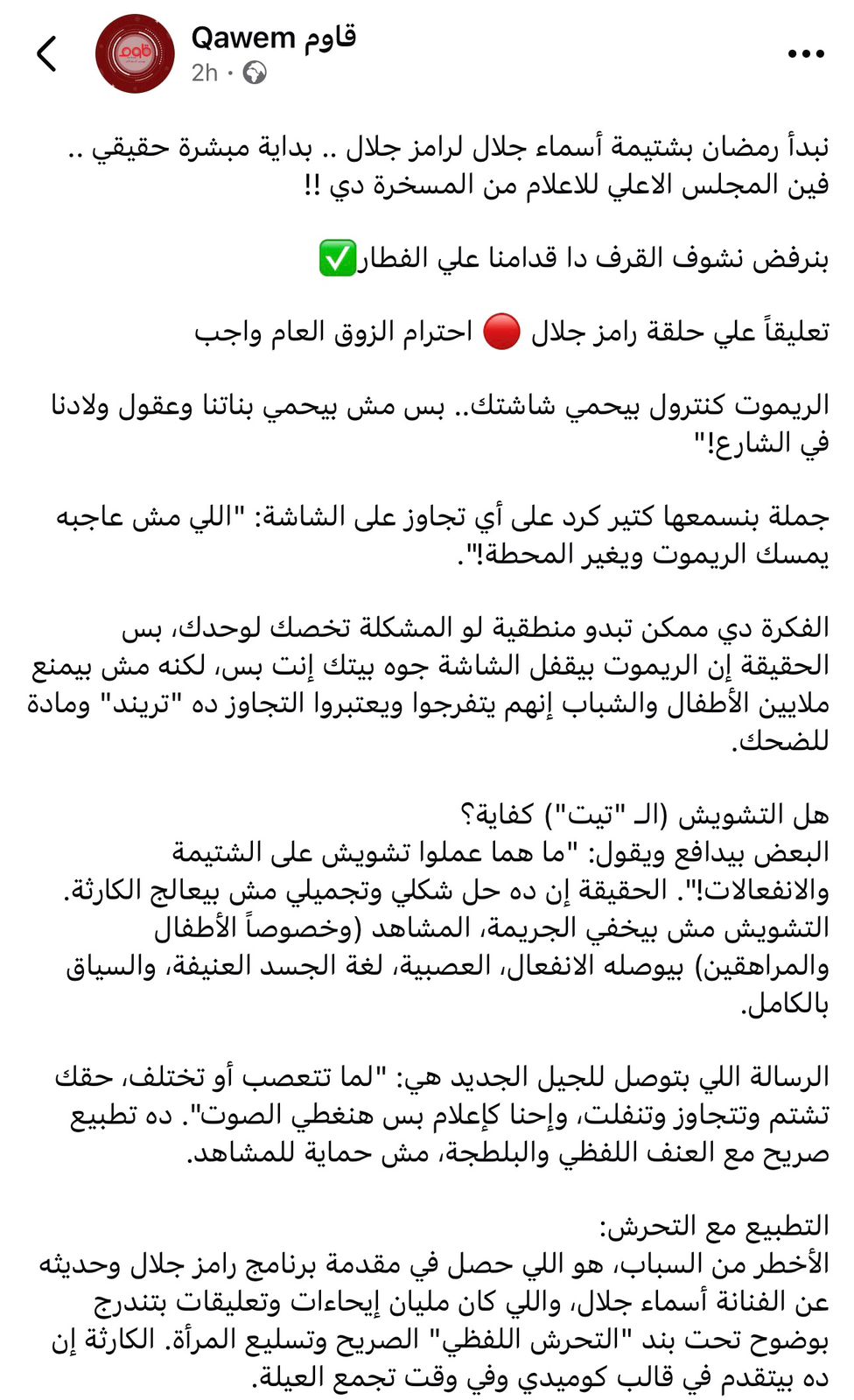 وعلقت صفحة قاوم قائلة: نبدأ رمضان بشتيمة أسماء جلال لرامز جلال .. بداية مبشرة حقيقي .. فين المجلس الاعلي للاعلام من المسخرة دي !! بنرفض نشوف القرف دا قدامنا علي الفطار تعليقاً علي حلقة رامز جلال احترام الزوق العام واجب ".