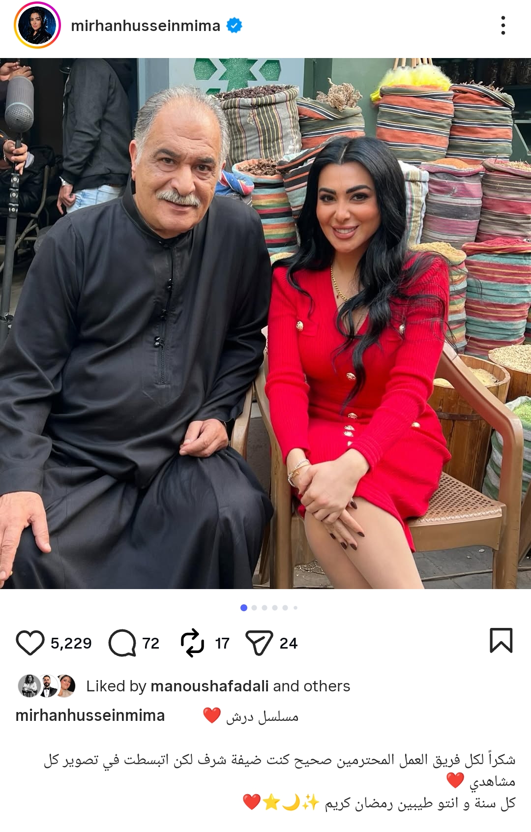 ونشرت ميريهان حسين صورا من الكواليس، من خلال حسابها الرسمي عبر موقع تبادل الصور والفيديوهات القصيرة إنستجرام، وعلقت: «مسلسل درش.. شكرا لكل فريق العمل المحترمين صحيح كنت ضيفة شرف لكن اتبسطت في تصوير كل مشاهدي.. كل سنة وانتو طيبين رمضان كريم».