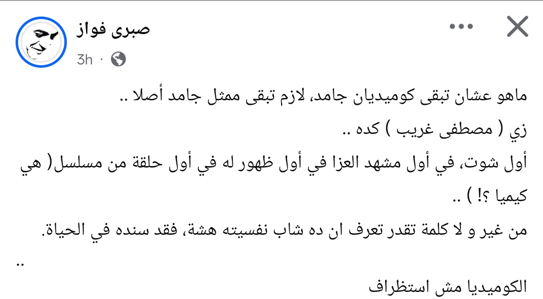 وكتب صبري فواز من خلال حسابه الرسمي عبر موقع التواصل الاجتماعي فيسبوك، علق: «ما هو عشان تبقى كوميديان جامد لازم تبقى ممثل جامد أصلا .. زي ( مصطفى غريب ) كده.. أول شوت، في أول مشهد العزا في أول ظهور له في أول حلقة من مسلسل ( هي كيميا ؟! )».