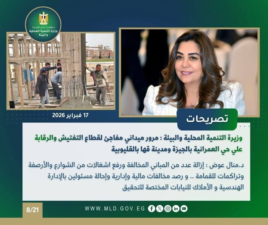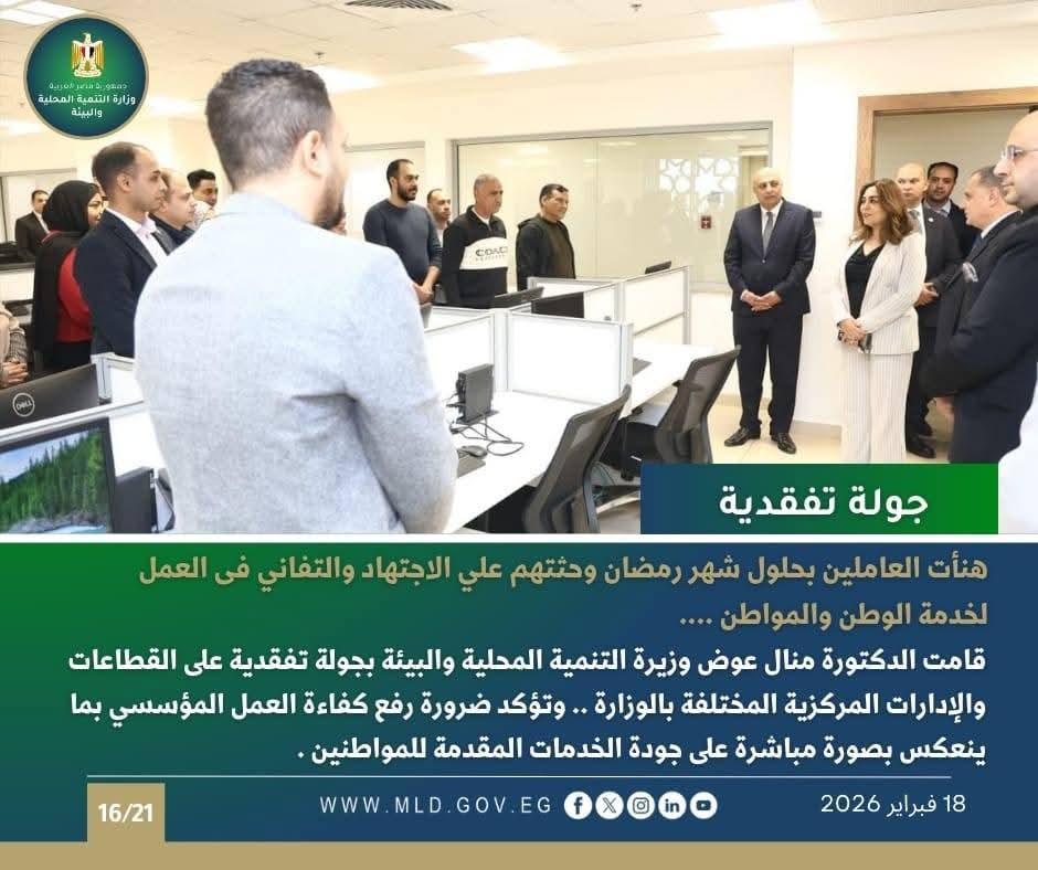 كما أعلنت وزيرة التنمية المحلية والبيئة، عن نتائج حملات قطاع التفتيش والمتابعة المفاجئة على مراكز ومدن محافظة أسوان خلال شهر فبراير الجاري، والتي استهدفت مراقبة أداء المراكز التكنولوجية، وفحص ملفات المتغيرات المكانية والتصالح، وضمان سرعة الاستجابة لطلبات المواطنين وتحقيق الانضباط الإداري والميداني.
