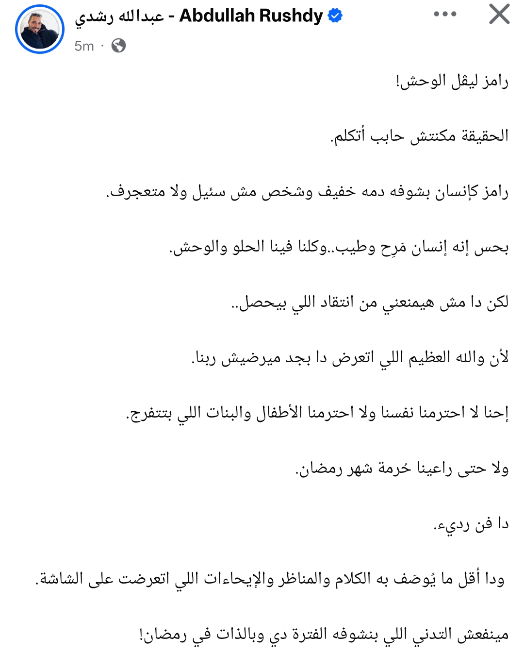 وكتب عبد الله رشدي من خلال حسابه الرسمي عبر موقع التواصل الاجتماعي فيسبوك: “رامز ليڤل الوحش!.. الحقيقة مكنتش حابب أتكلم، رامز كإنسان بشوفه دمه خفيف وشخص مش سئيل ولا متعجرف، بحس إنه إنسان مَرِح وطيب..وكلنا فينا الحلو والوحش”.