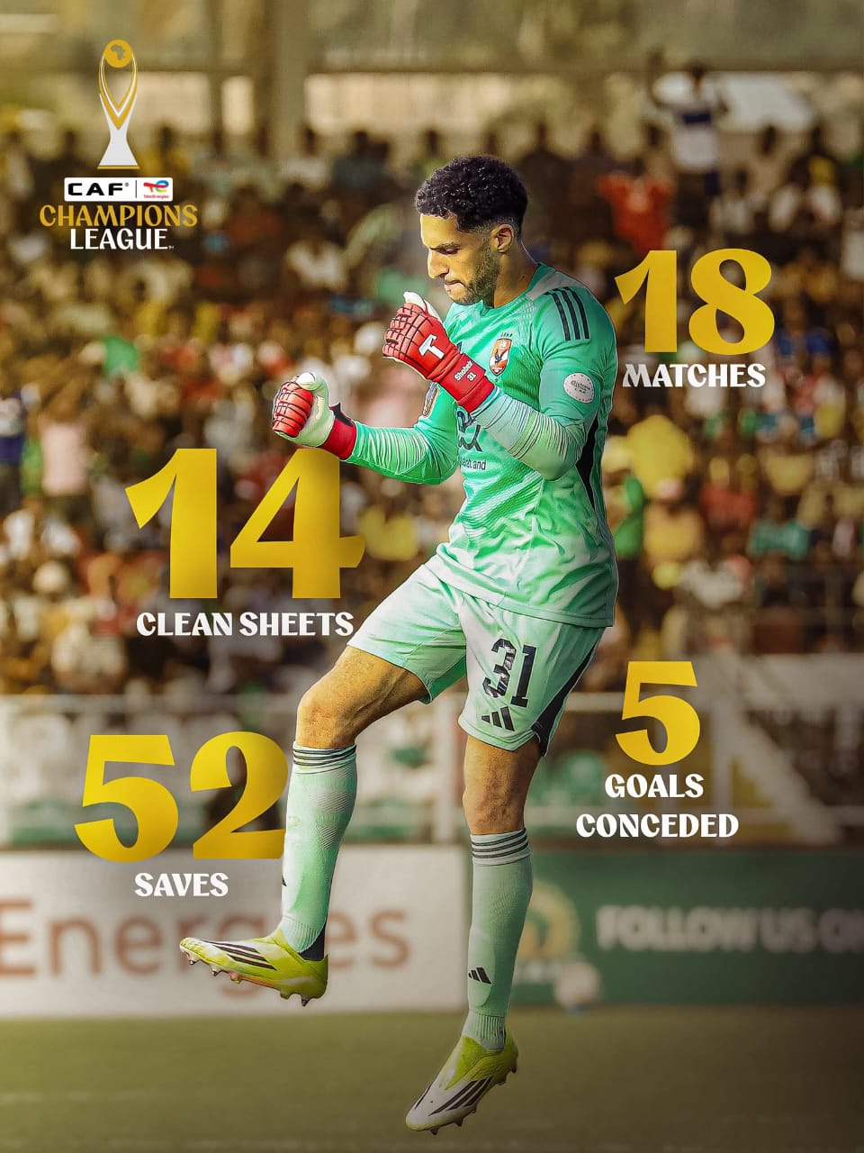 وبحسب أرقام نشرها كاف، خاض الحارس 18 مباراة في دوري الأبطال، ونجح في الحفاظ على نظافة شباكه خلال 14 مواجهة، بينما استقبل 5 أهداف فقط، كما تصدى لـ52 فرصة محققة.