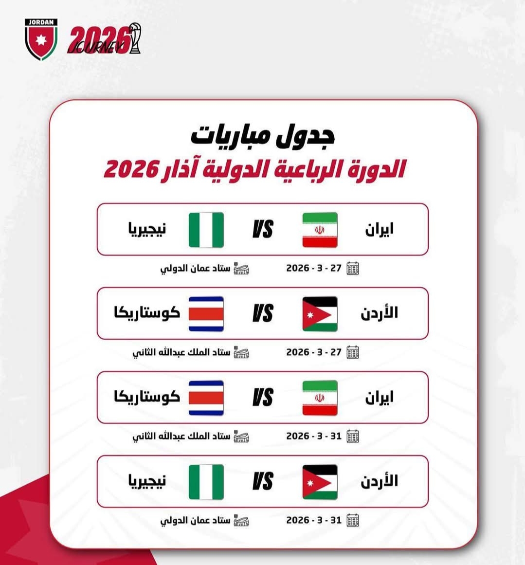 ويشارك في بطولة رباعية ودية بالعاصمة الأردنية عمان، بمشاركة منتخبات إيران، الأردن، وكوستاريكا.