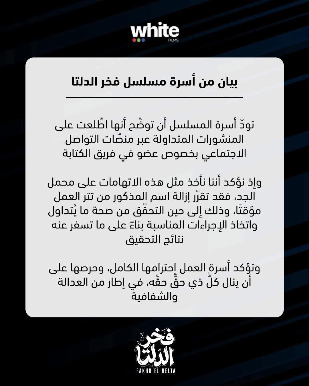 وجاء بيان من أسرة مسلسل فخر الدلتا كالتالي: «تود أسرة المسلسل أن توضّح أنها اطلعت على المنشورات المتداولة عبر منصات التواصل الاجتماعي بخصوص عضو في فريق الكتابة».