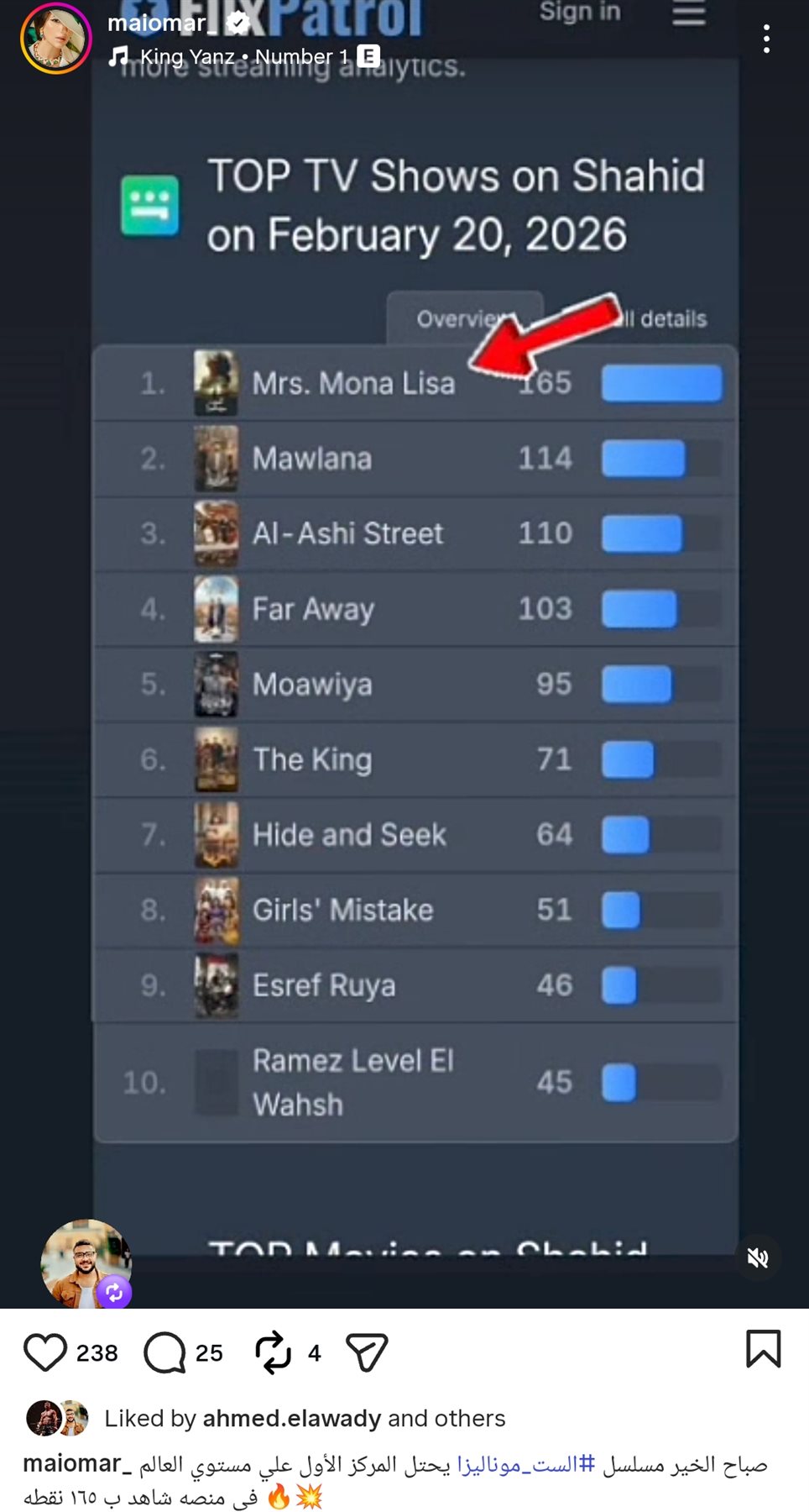وكتبت مي عمر من خلال حسابها الرسمي عبر موقع تبادل الصور والفيديوهات القصيرة إنستجرام، قالت: صباح الخير مسلسل الست موناليزا يحتل المركز الأول علي مستوي العالم في منصه شاهد ب ١٦٥ نقطه.