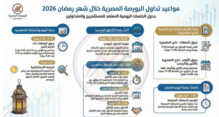 أعلنت إدارة البورصة المصرية عن تعديل مواعيد جلسات التداول اليومية خلال شهر رمضان المبارك لعام 2026، ويأتي هذا التعديل السنوي ليتماشى مع تقليص ساعات العمل في القطاع المصرفي، مع الحفاظ على كفاءة التداولات وحقوق المستثمرين في "سوق الأوراق المالية".