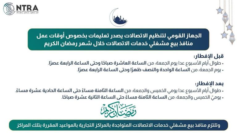 أصدر الجهاز القومي لتنظيم الاتصالات تعليمات ملزمة لكافة مشغلي خدمات المحمول في مصر بخصوص مواعيد التعامل مع الجمهور خلال شهر رمضان المبارك، ويهدف القرار إلى تنظيم أوقات عمل الفروع بما يتناسب مع احتياجات المواطنين قبل وبعد الإفطار.